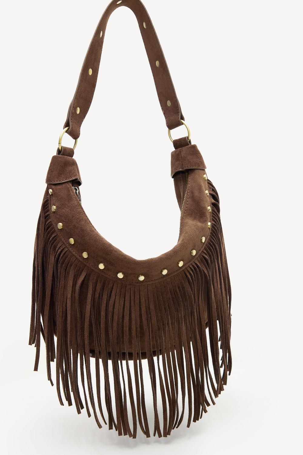 Bolso marrón con flecos 49,99 €Este bolso de hombro marrón tipo ante presenta flecos llamativos por todas partes para un look boho atrevido. Las tachuelas doradas y la correa de hombro ajustable le dan a este bolso un toque rock-chic. La espaciosa forma de hobo con detalles de flecos en movimiento crea un ambiente fresco listo para el festival. Combina este bolso con un mini vestido y botas vaqueras para un look icónico de noche de concierto.