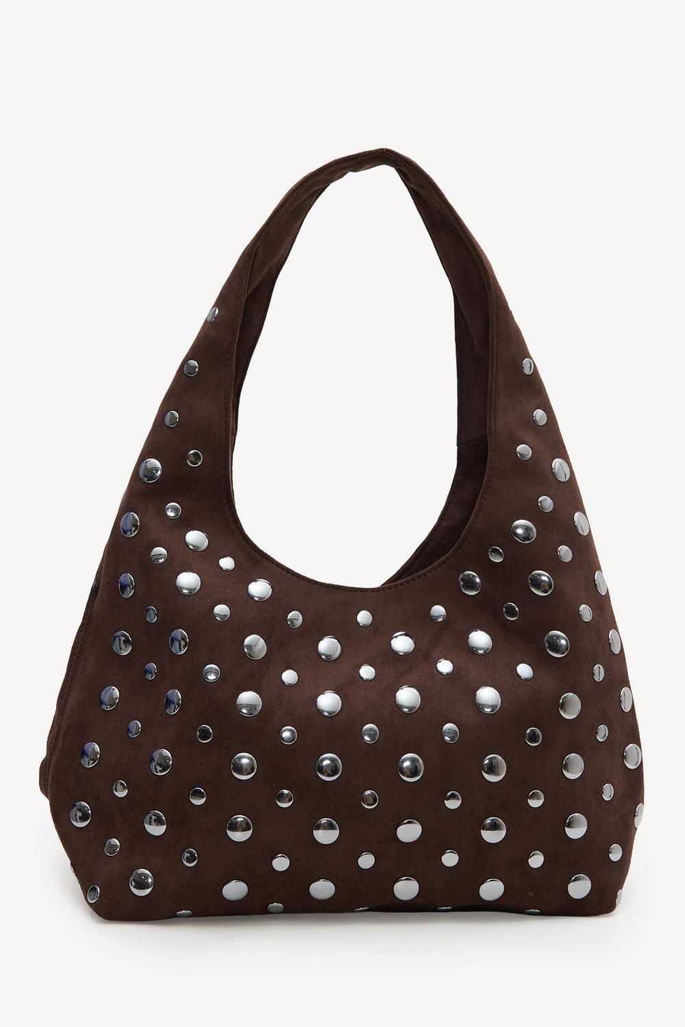 Este bolso de hombro de imitación de ante marrón presenta llamativos tachuelas plateadas para un look atrevido y llamativo. La espaciosa forma de hobo con una correa de hombro cómoda hace que este bolso sea perfecto para el uso diario. La suave textura de ante combinada con las tachuelas metálicas crea una apariencia rock-chic genial. Combina este bolso con un blazer oversize y jeans ajustados para un look casual moderno.