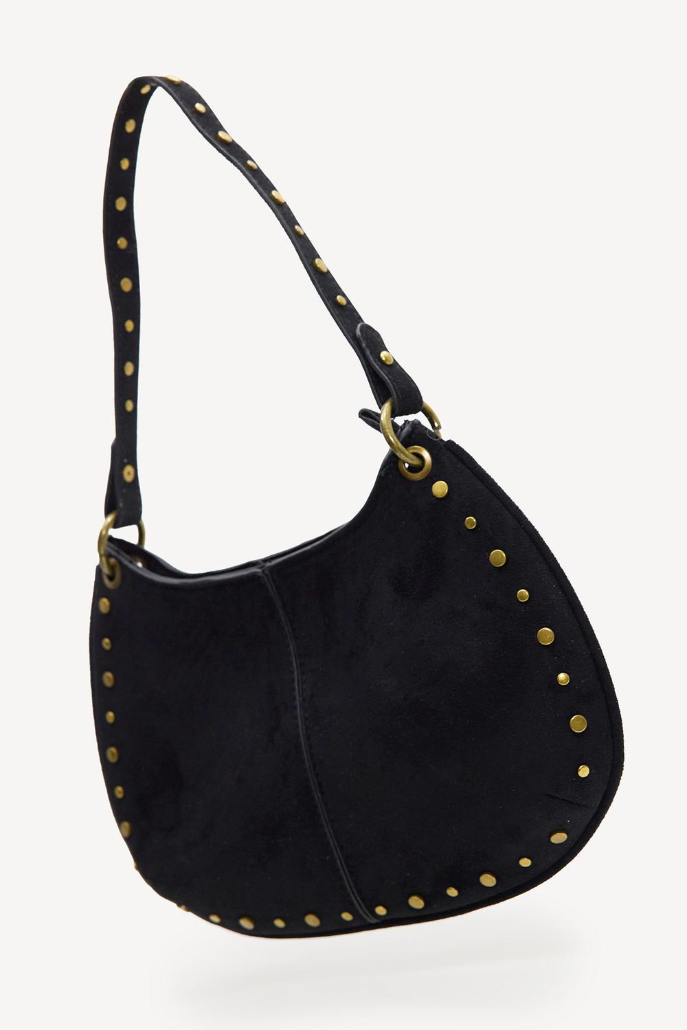 Bolso negro con tachuelas 39,99 €Este bolso de hombro negro de imitación de ante tiene tachuelas doradas por todas partes para un look atrevido. La forma curva crea un estilo hobo moderno. La textura suave de ante y las tachuelas llamativas le dan a este bolso una apariencia rock-chic lujosa.