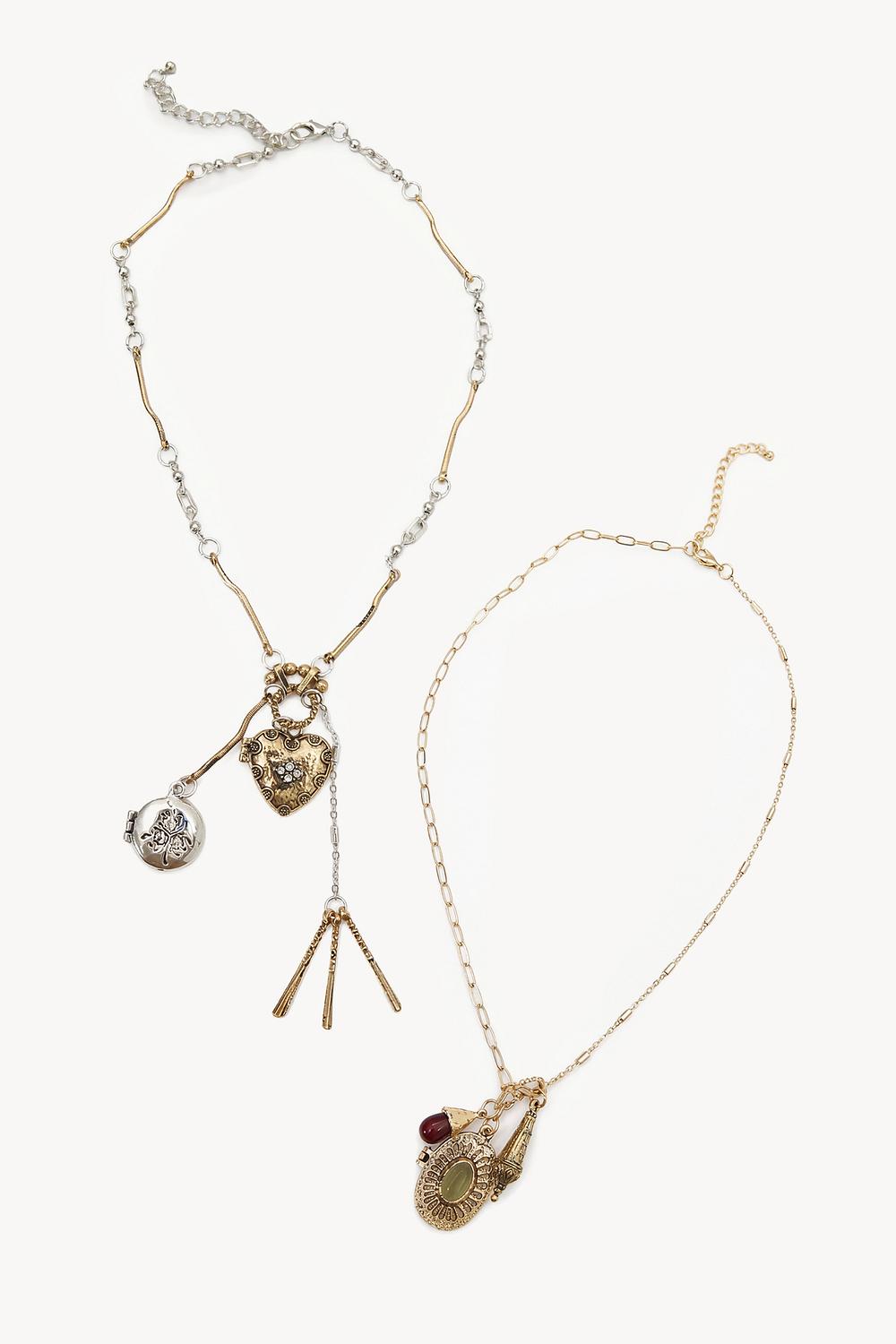 Este collar dorado de 2 piezas presenta detalles de encanto llamativos con varios colgantes para un efecto en capas. El collar combina eslabones de oro y plata con dijes decorativos como corazones y monedas. La longitud ajustable asegura un ajuste perfecto y la mezcla de texturas crea un aspecto boho-chic. Estiliza este collar solo para un look llamativo o combínalo con otros collares para un estilo en capas a la moda.