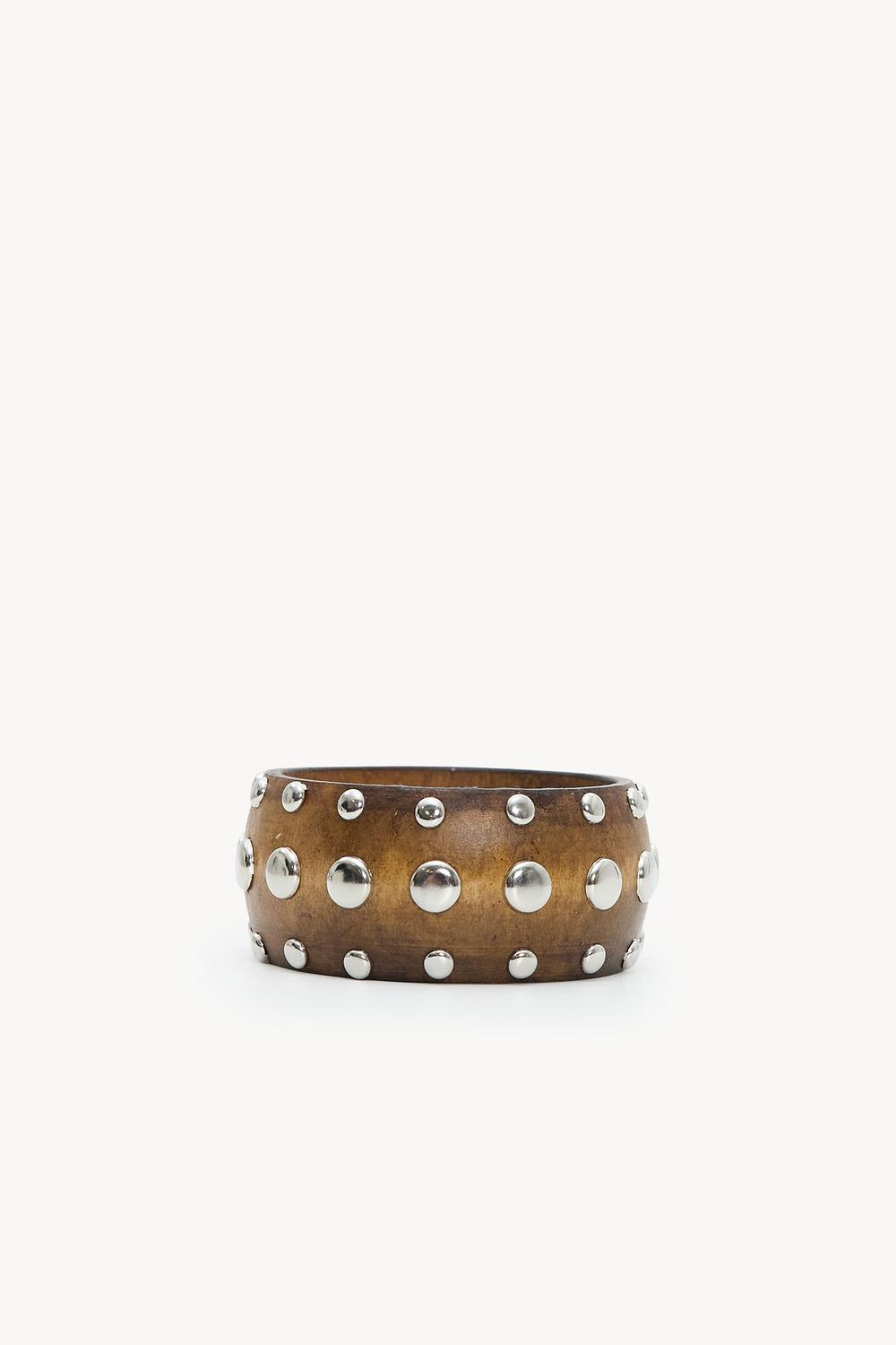 Esta pulsera de madera marrón tiene una forma ancha con tachuelas llamativas por todas partes para un look de declaración atrevido. El color marrón oscuro y los detalles metálicos le dan a este accesorio una apariencia rock-chic. El ajuste ancho proporciona un giro moderno al diseño clásico con tachuelas. Perfecto para darle a tu atuendo un toque fresco.