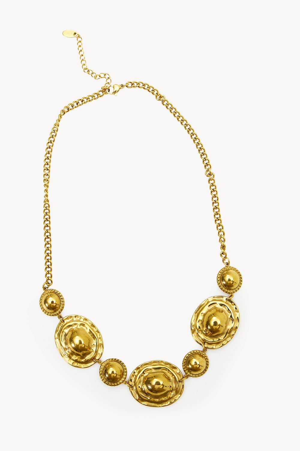 Este collar de declaración dorado presenta detalles redondos llamativos en varios tamaños. La cadena gruesa con elementos escultóricos crea un aspecto lujoso que destaca de inmediato. El cierre ajustable asegura un ajuste perfecto. Combina este collar con un top sin tirantes para una apariencia elegante en una cita para cenar.