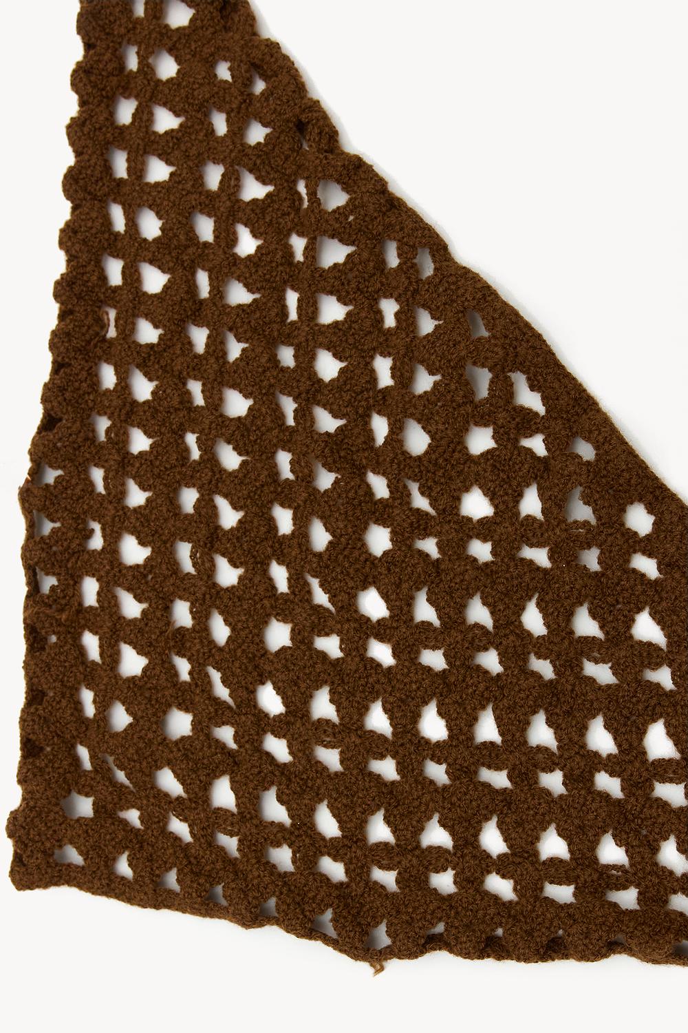 Esta bufanda marrón presenta un llamativo patrón de crochet con detalles abiertos para un look bohemio. El diseño con forma triangular crea un accesorio llamativo que se alinea perfectamente con la tendencia boho actual. El color marrón cálido se combina sin esfuerzo con diferentes conjuntos. Estiliza esta bufanda sobre una camiseta básica y jeans de pierna ancha para un look chic sin esfuerzo.