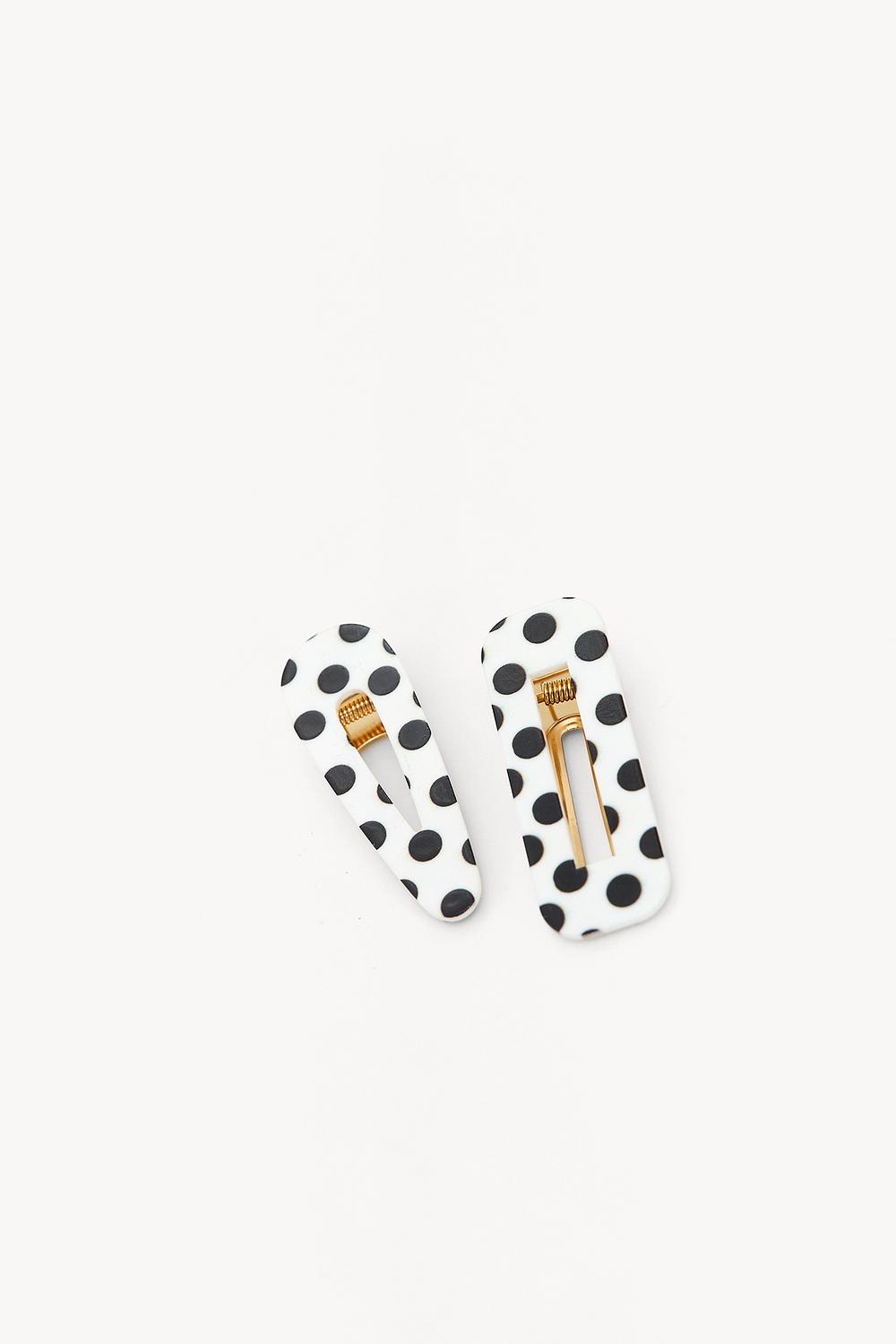 Pinzas para el pelo blancas con lunares, paquete de 2. 7,99 €Estos clips para el cabello en color blanco roto presentan un llamativo estampado de lunares con puntos negros para un look llamativo. El conjunto de dos clips con cierre dorado crea un acento chic en tu cabello. Perfecto para combinar tu peinado con un atuendo de lunares para una vibra de conjunto genial.