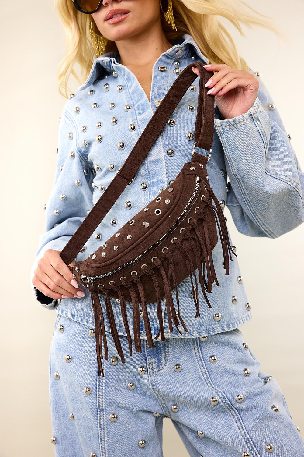 Este bolso tipo riñonera de color marrón oscuro, similar a la gamuza, presenta tachuelas llamativas por todas partes y flecos llamativos para un look atrevido. El ajuste compacto con detalles de flecos en movimiento crea una apariencia rock-chic genial. La correa ajustable asegura comodidad y versatilidad al usarlo. Estiliza este bolso cruzado con un conjunto de mezclilla para un look listo para el festival.