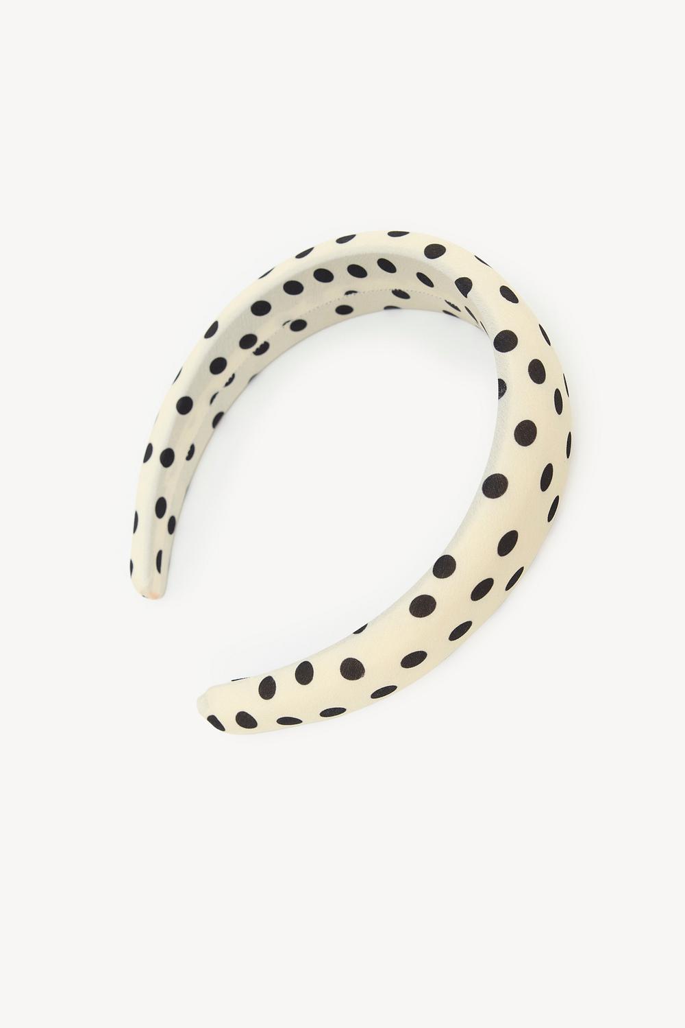 Esta diadema blanca presenta un encantador estampado de lunares con puntos negros por todas partes. La forma ancha y acolchada asegura un ajuste cómodo y un toque vintage. La calidad 100% algodón le da a esta diadema una textura suave. Estiliza este accesorio llamativo con tu cabello en un moño bajo para un look retro chic.