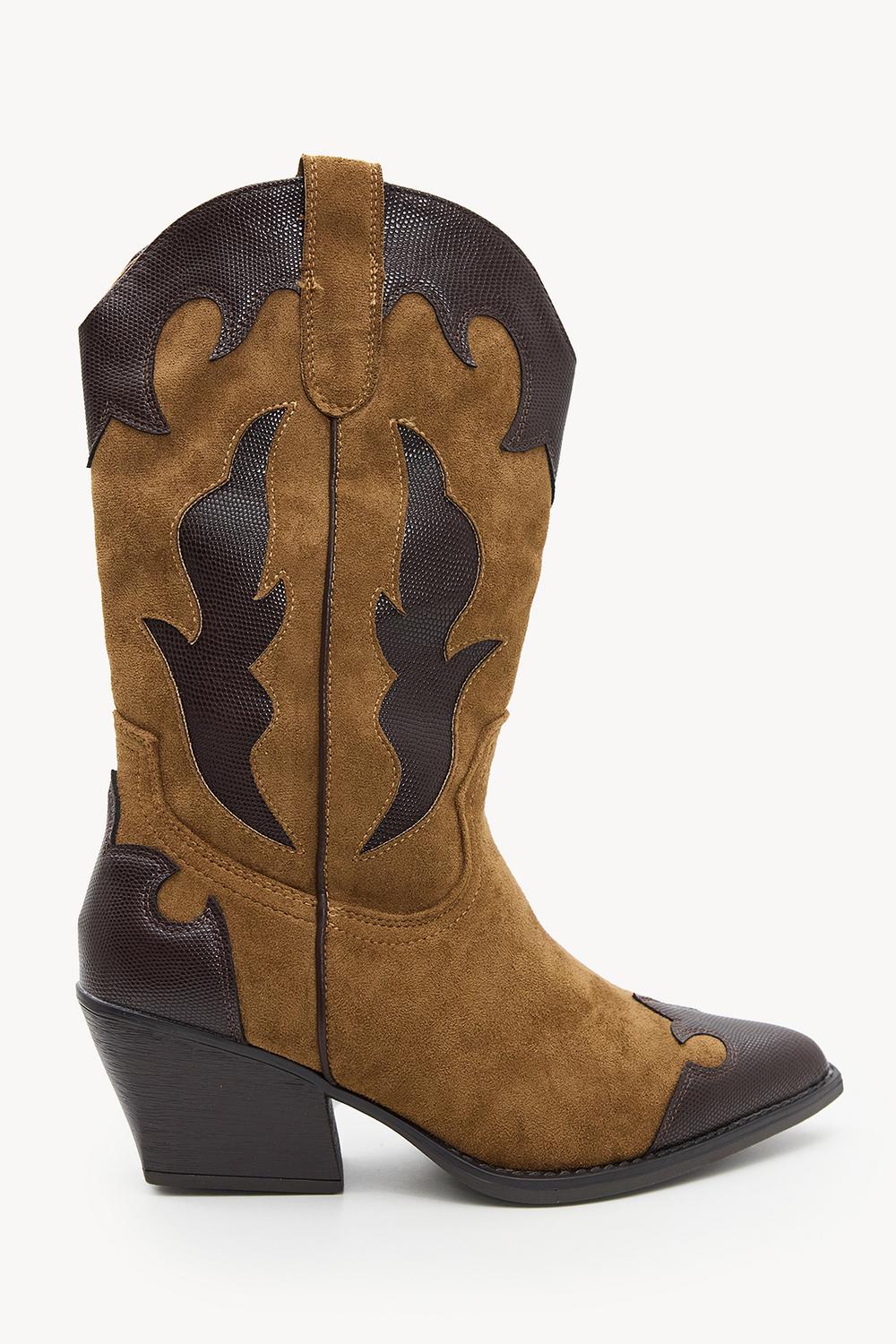 Botas cowboy marrón 65,99 €Estas botas vaqueras marrones de imitación de ante cuentan con llamativos detalles de llamas negras para un look occidental atrevido. La punta puntiaguda con costuras de contraste y el tacón de altura media le dan a estas botas un giro moderno. La silueta clásica de vaquero con patrones de llamas decorativas crea una pieza llamativa para tu guardarropa. Combina estas botas con un vestido mini y una bolsa de flecos para un look de festival completo.