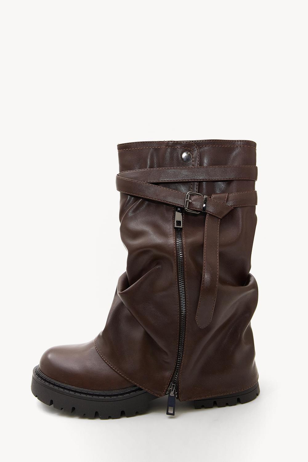 Estas botas altas de color marrón oscuro tienen un aspecto atrevido con detalles de hebillas llamativas y una cremallera lateral. La suela robusta y el acabado de cuero vegano le dan a estas botas una apariencia audaz. El ajuste relajado con correas decorativas crea un ambiente rock-chic fresco. Combina estas botas con un blazer oversize y una mini falda para un look a la moda.