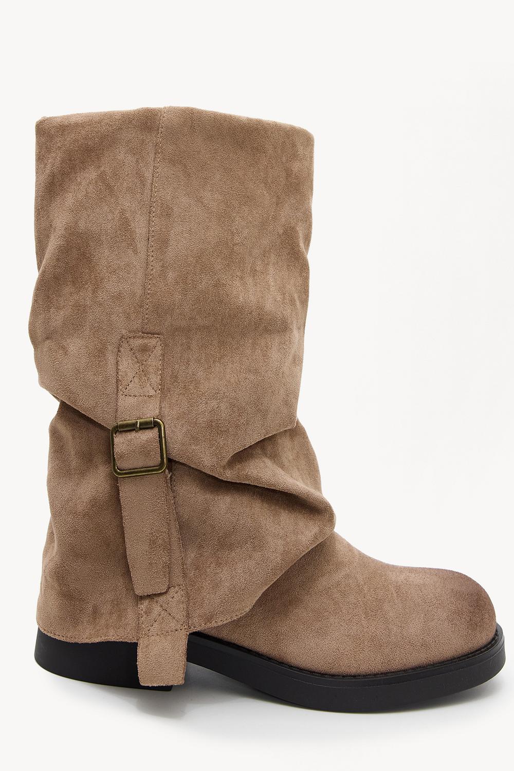Estas botas de color arena tipo gamuza tienen un diseño relajado y holgado con detalles de hebillas llamativas. El eje alto con un ajuste drapeado y correas decorativas crea un look fresco inspirado en el oeste. La suela plana asegura comodidad durante largos días. Combina estas botas con shorts de mezclilla para un atuendo casual listo para el festival.