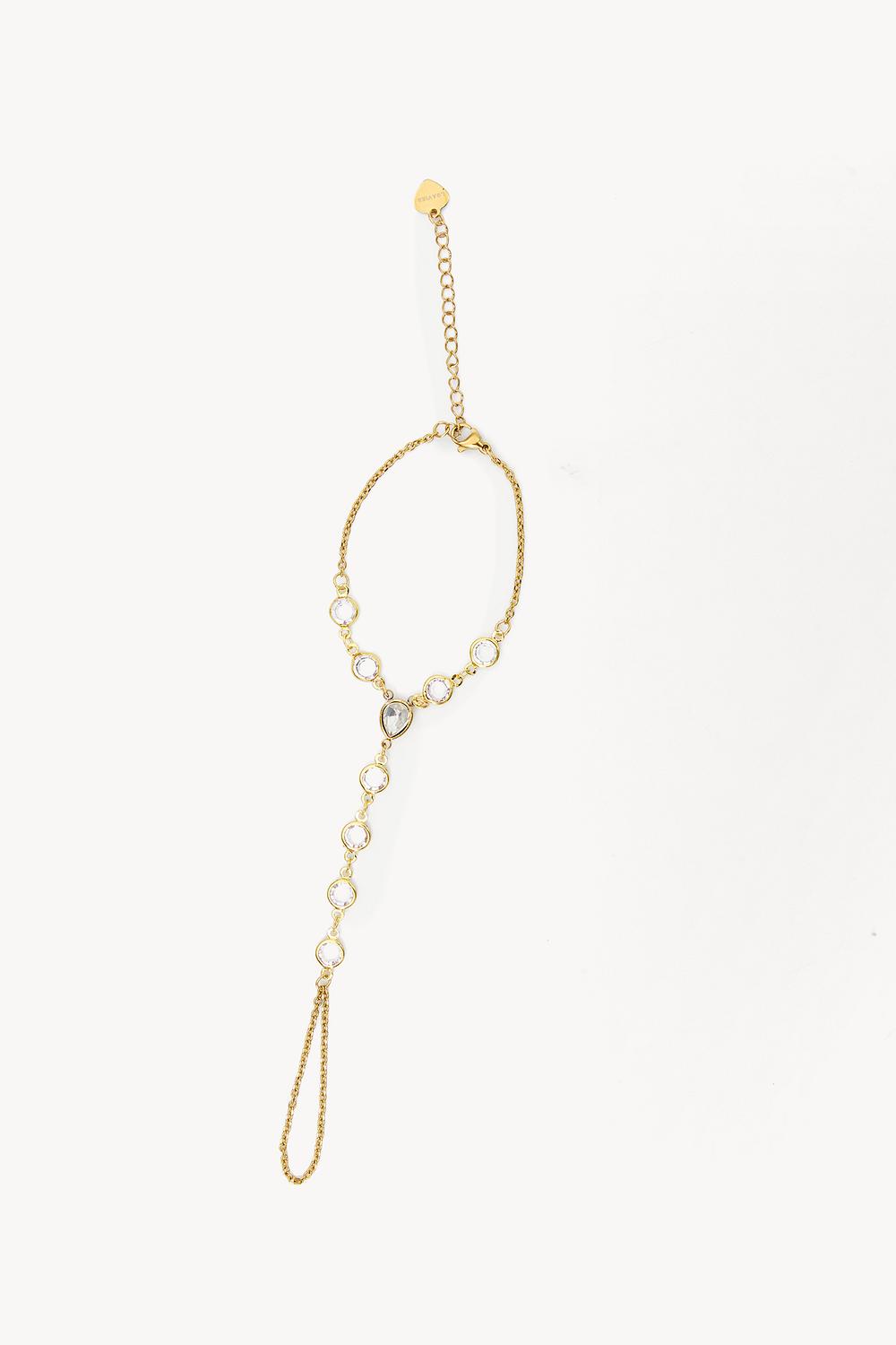 Esta cadena de mano dorada presenta un diseño llamativo con eslabones redondos que van de la muñeca al dedo. El accesorio moderno combina una pulsera delicada con una conexión de anillo para un look atrevido. El acabado de aleación dorada le da a esta joya de mano una apariencia lujosa. Estiliza esta llamativa cadena de mano con un conjunto negro básico para una mejora instantánea.