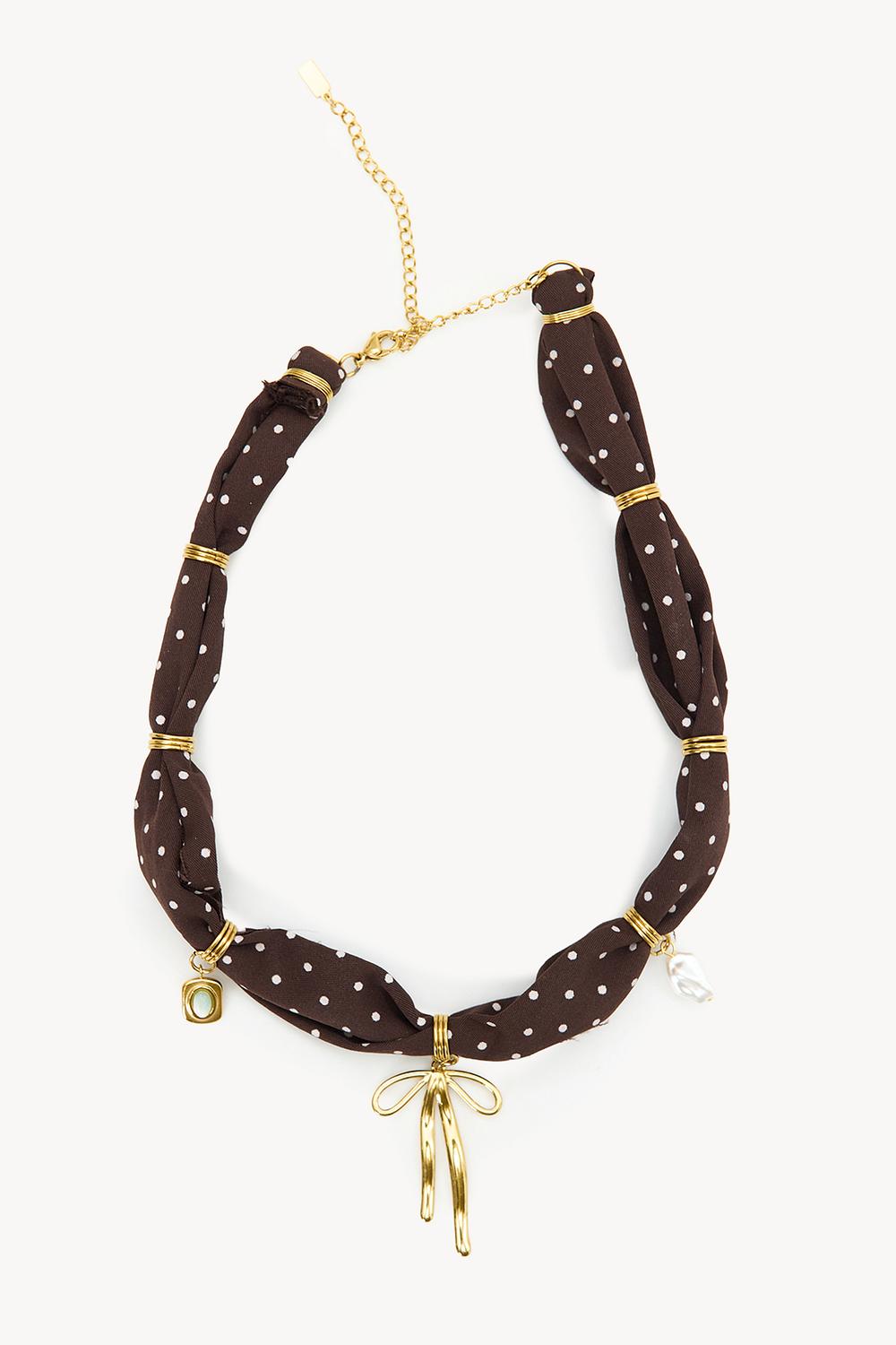 Este collar statement marrón presenta un llamativo estampado de lunares con acentos dorados. El diseño de cadena gruesa con eslabones retorcidos y un charm de lazo dorado crea una apariencia lujosa. La calidad de acero inoxidable chapado en oro al 100% garantiza durabilidad y un aspecto premium. Combina este collar con una camisa blanca básica para un look de oficina elegante.