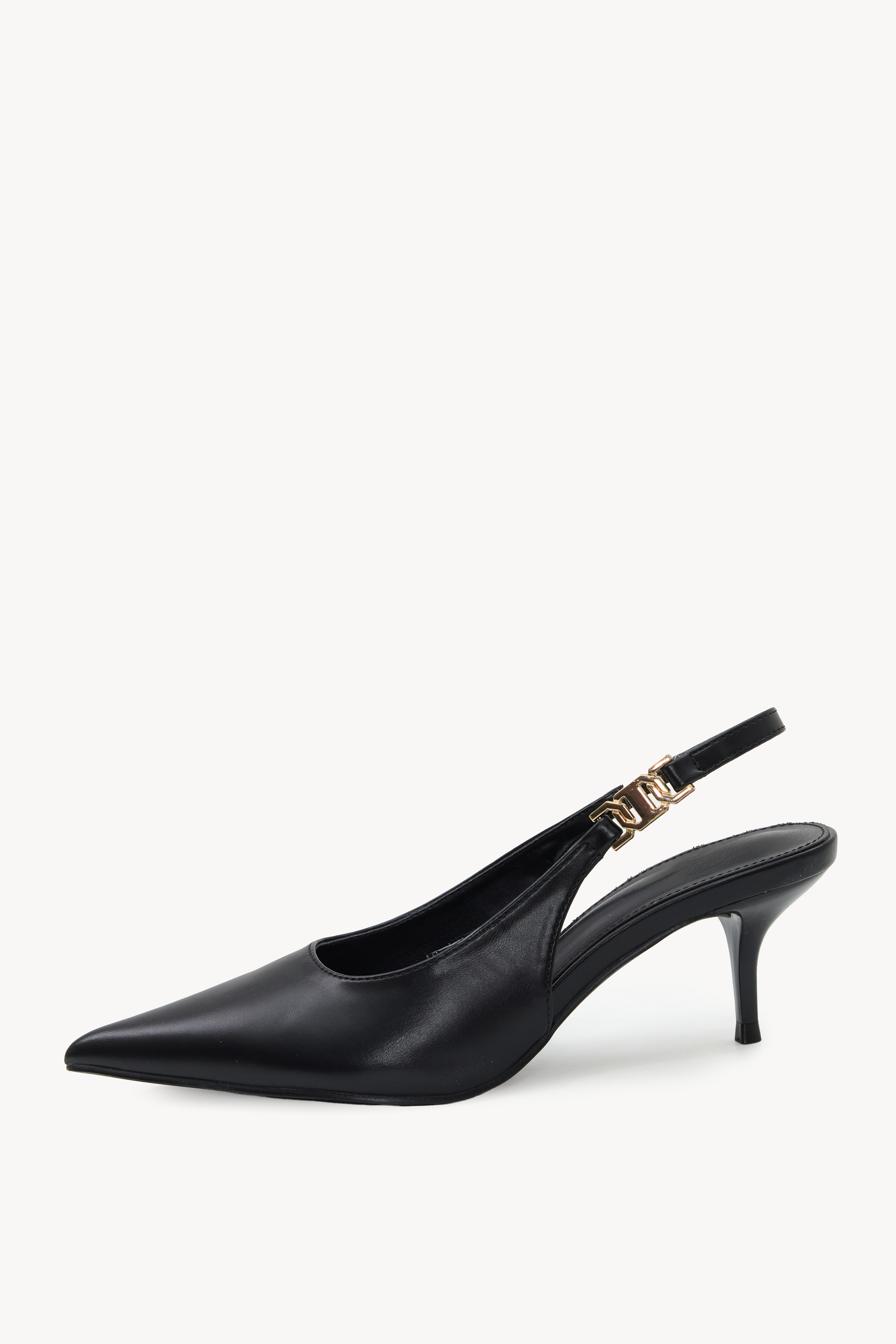 Estos slingbacks negros de punta afilada cuentan con un tacón kitten chic y herrajes dorados llamativos. El acabado de aspecto cuero elegante con una correa en el tobillo crea un look sofisticado. Combina estos zapatos con vaqueros de pierna ancha para un look de oficina actualizado.