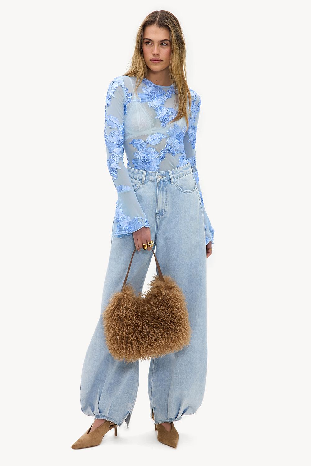 Camiseta azul con detalle floral 39,99 €Esta camiseta de manga larga azul claro presenta un llamativo estampado floral para un toque romántico. La silueta ajustada con cuello simulado y detalles de malla transparente crea un look femenino. Las mangas largas con un ligero estiramiento aseguran comodidad y un ajuste perfecto. Combina esta camiseta con jeans de cintura alta para un atuendo casual chic.