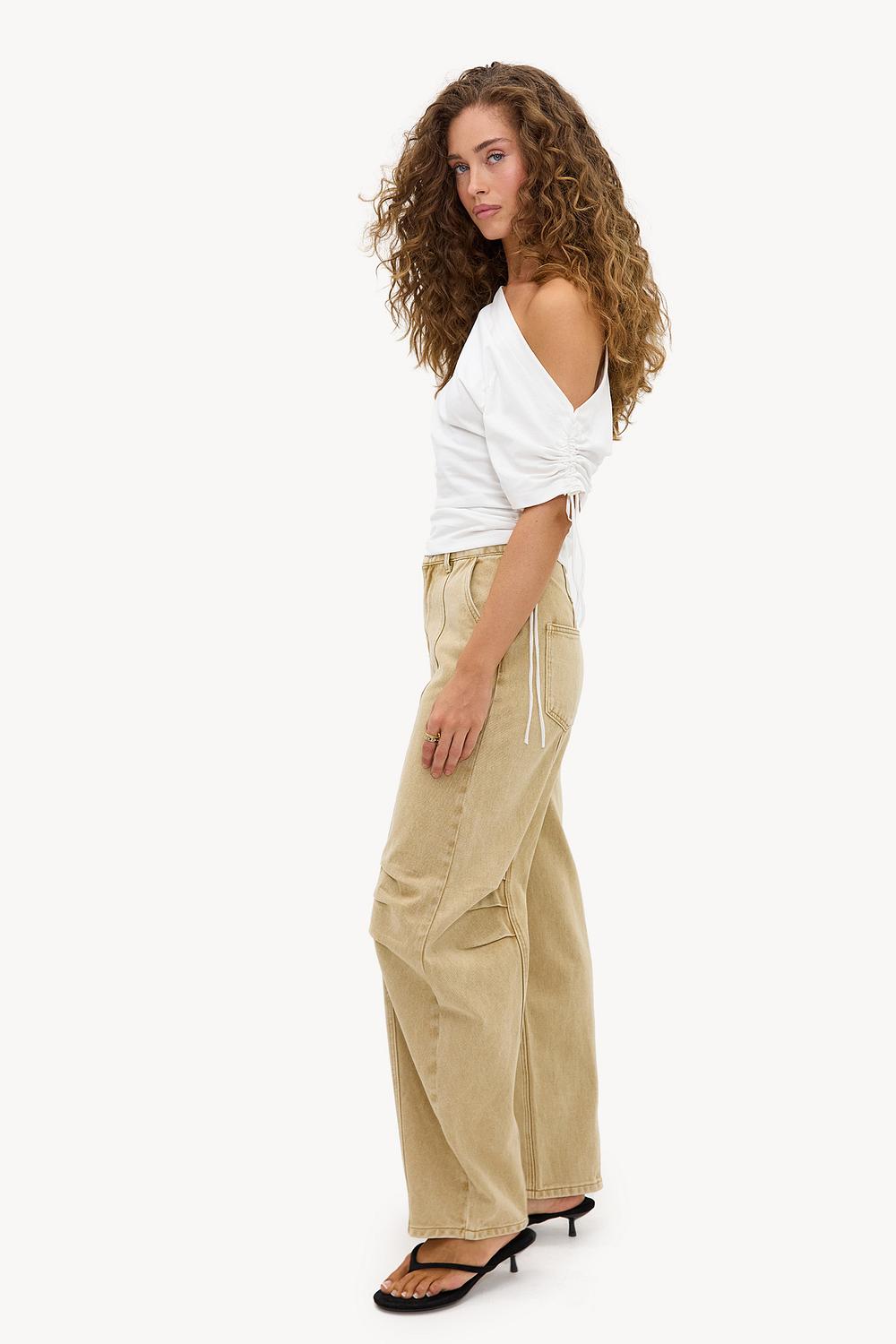 Vaqueros acampanados beige 59,99 €Estos jeans beige de pierna ancha cuentan con bolsillos cargo llamativos y costuras contrastantes para un look inspirado en lo utilitario. El ajuste relajado con cintura alta crea una forma cómoda con detalles llamativos. La mezcla de algodón suave garantiza comodidad y durabilidad. Combina estos jeans con un top corto y zapatillas gruesas para un look casual de ciudad.