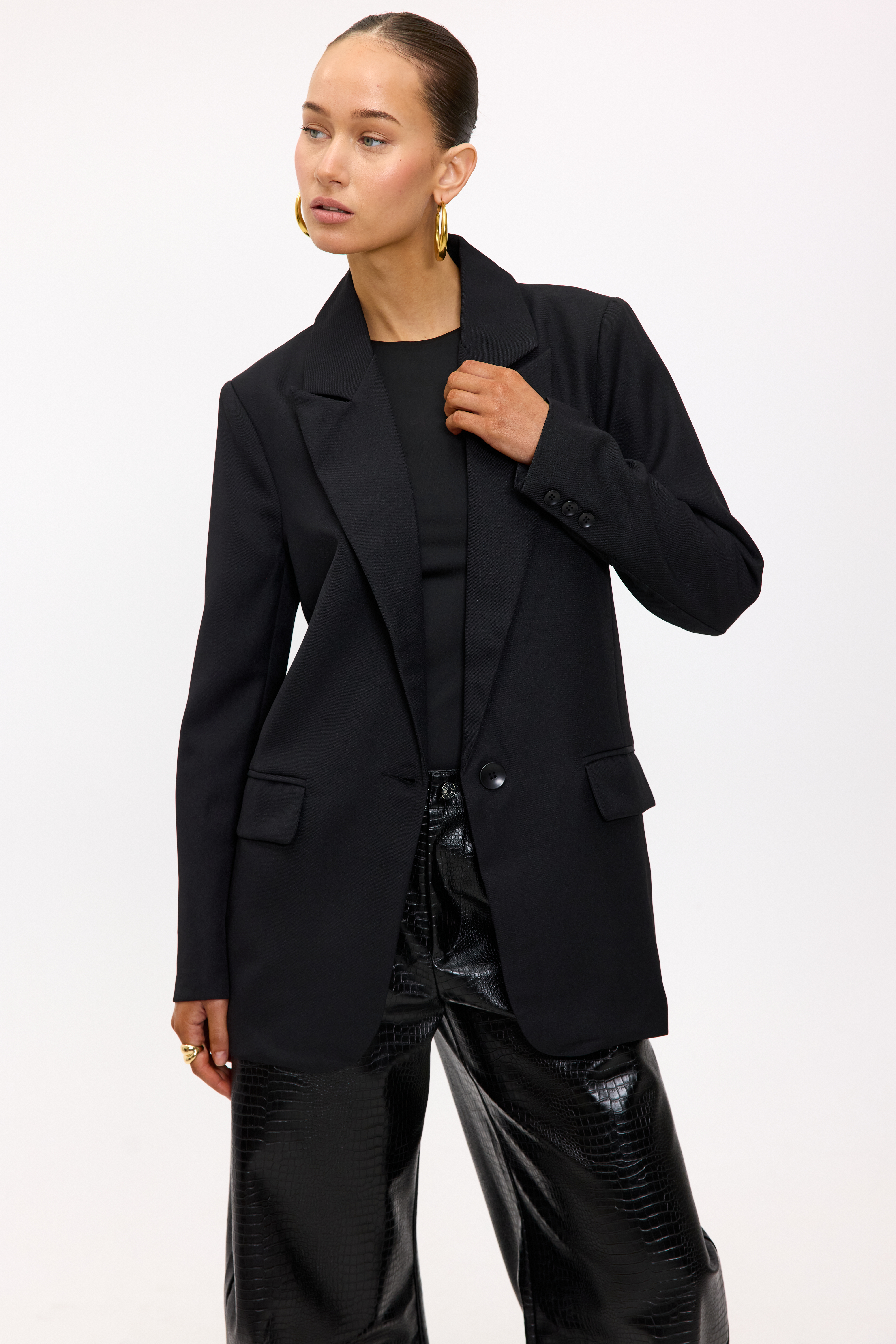 Americana extragrande 59,99 €Esta blazer negra presenta un ajuste clásico con cierre de botones llamativo para un look elegante. El ajuste oversize con hombreras y bolsillos en el pecho crea una silueta poderosa. La mezcla de poliéster asegura comodidad y una apariencia lujosa. Combina este blazer con un top brillante y pantalones de pierna ancha para un atuendo de fiesta impresionante.