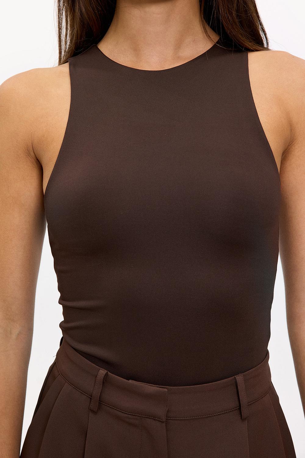 Ce body marron foncé présente un effet scintillant luxueux pour un look affirmé. La coupe sans manches avec col montant crée une apparence chic qui complète parfaitement votre silhouette. La qualité stretch assure un confort optimal et un ajustement parfait. Associez ce body avec un jean à jambes larges pour un look sophistiqué.
