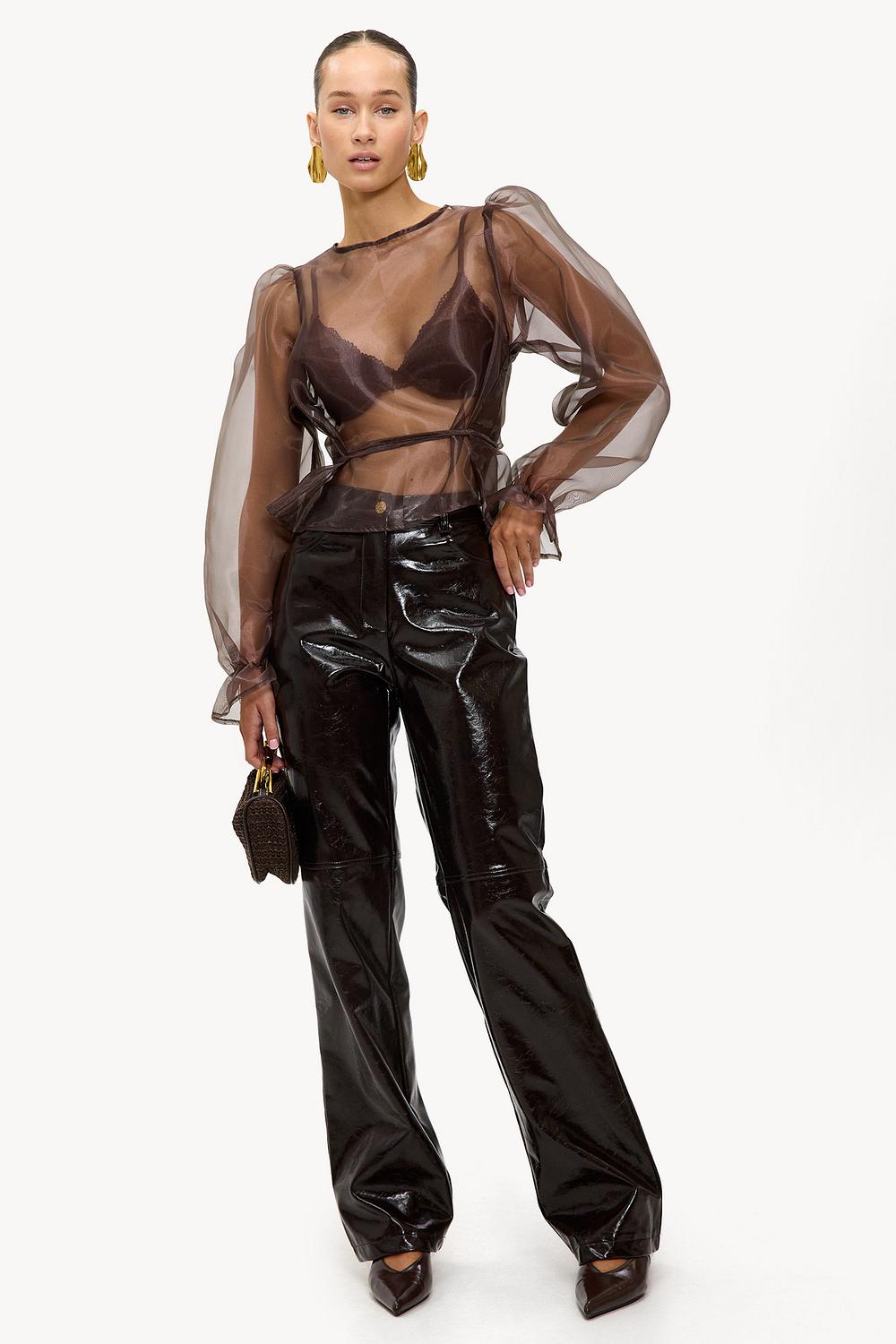 Cette blouse transparente marron présente des manches ballon statement pour une touche luxueuse. Le style enveloppant avec ceinture à nouer et les détails subtils de volants sur les manches créent un look sophistiqué. Associez cette blouse avec un pantalon effet cuir pour un look époustouflant lors d'une soirée entre filles.