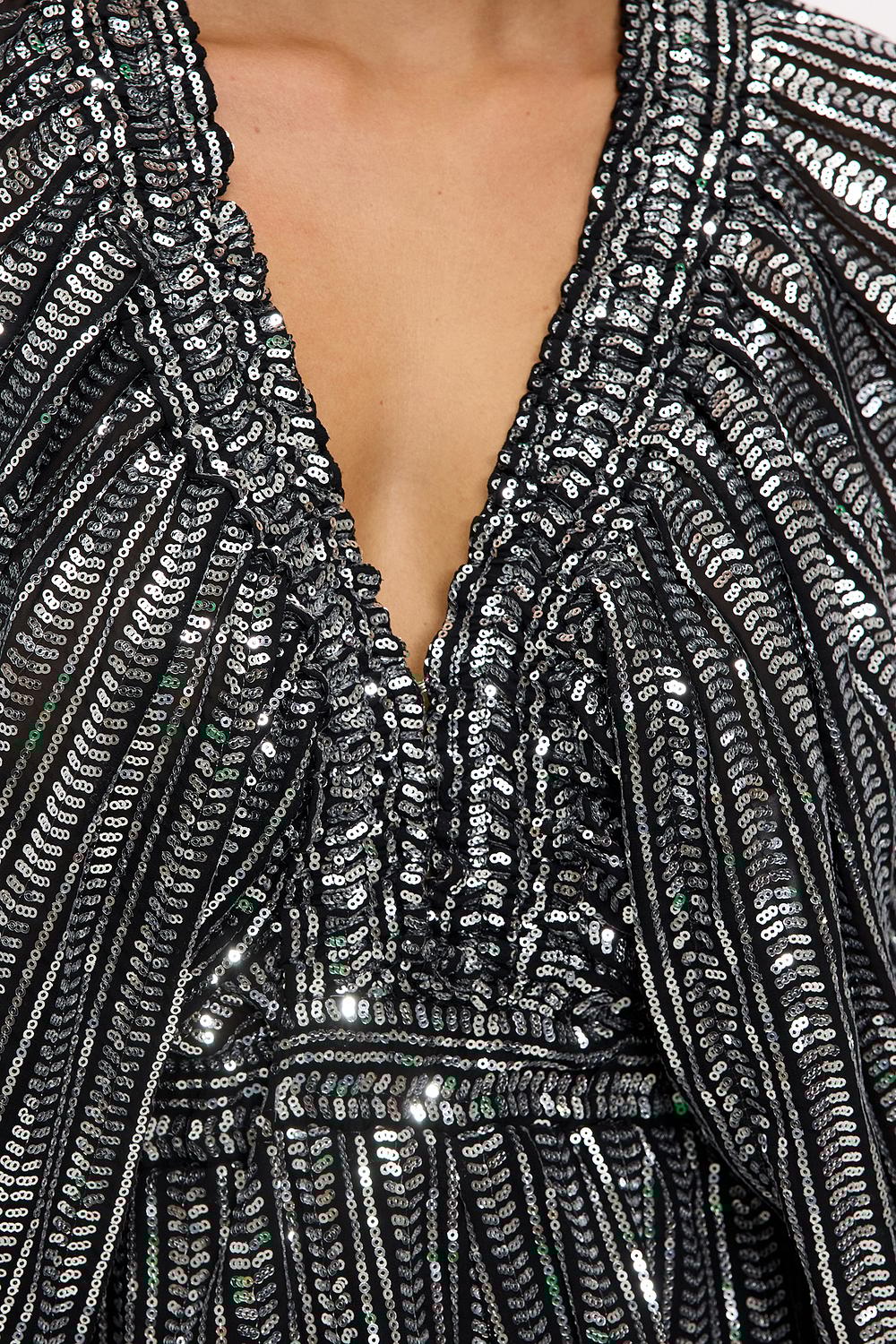 Cette combinaison à sequins argentés présente un motif saisissant qui fait instantanément sensation. Le style portefeuille avec un décolleté en V profond et des manches ballon dramatiques crée un look de fête luxueux. La coupe courte avec une taille élastique accentue élégamment la silhouette. Associez cette combinaison avec des boucles d'oreilles audacieuses et des talons hauts pour une soirée entre filles.