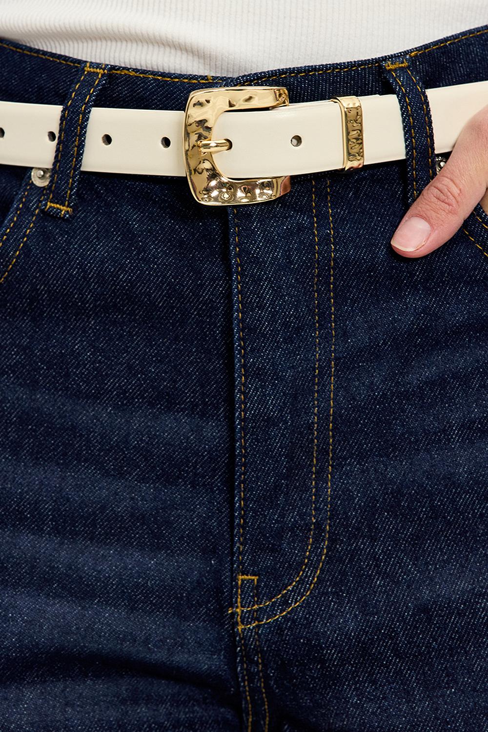 Cette ceinture blanc cassé présente une boucle dorée avec des clous pour une touche luxueuse. La coupe basique avec des trous réglables assure un ajustement parfait avec n'importe quelle tenue. La qualité 100% polyuréthane donne à cette ceinture une finition aspect cuir. Portez cette ceinture avec un jean taille haute pour un look chic et décontracté.