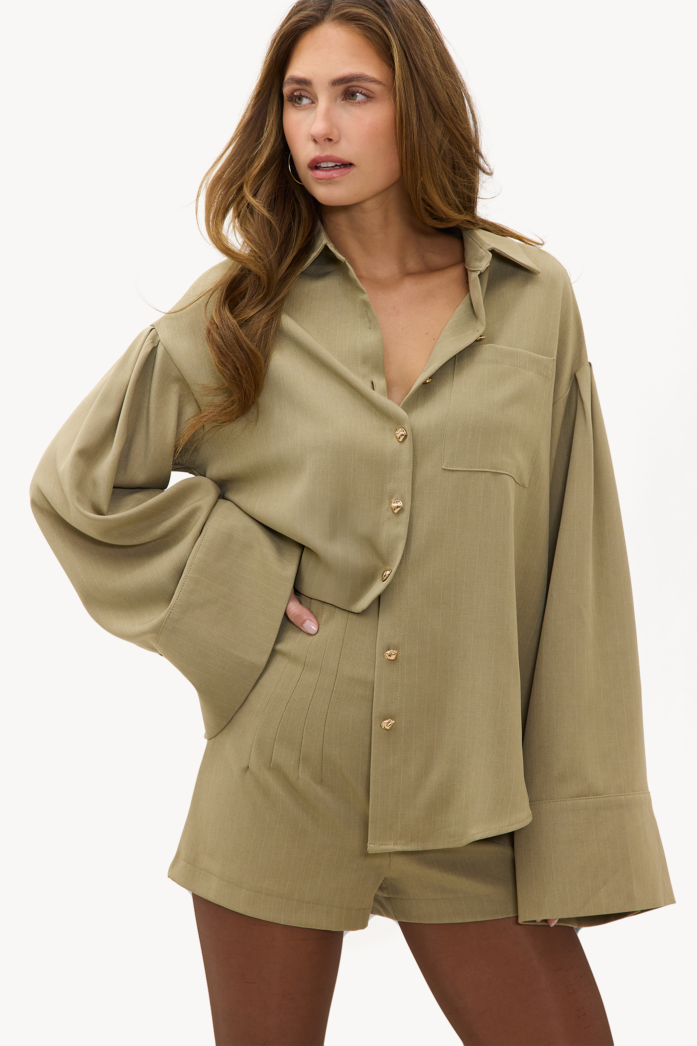 Ce short vert olive a une coupe ajustée chic avec des plis subtils à l'avant. La coupe taille haute avec des coutures décoratives crée un look sophistiqué. Associez ce short avec la blouse oversize assortie pour un look coordonné époustouflant.
