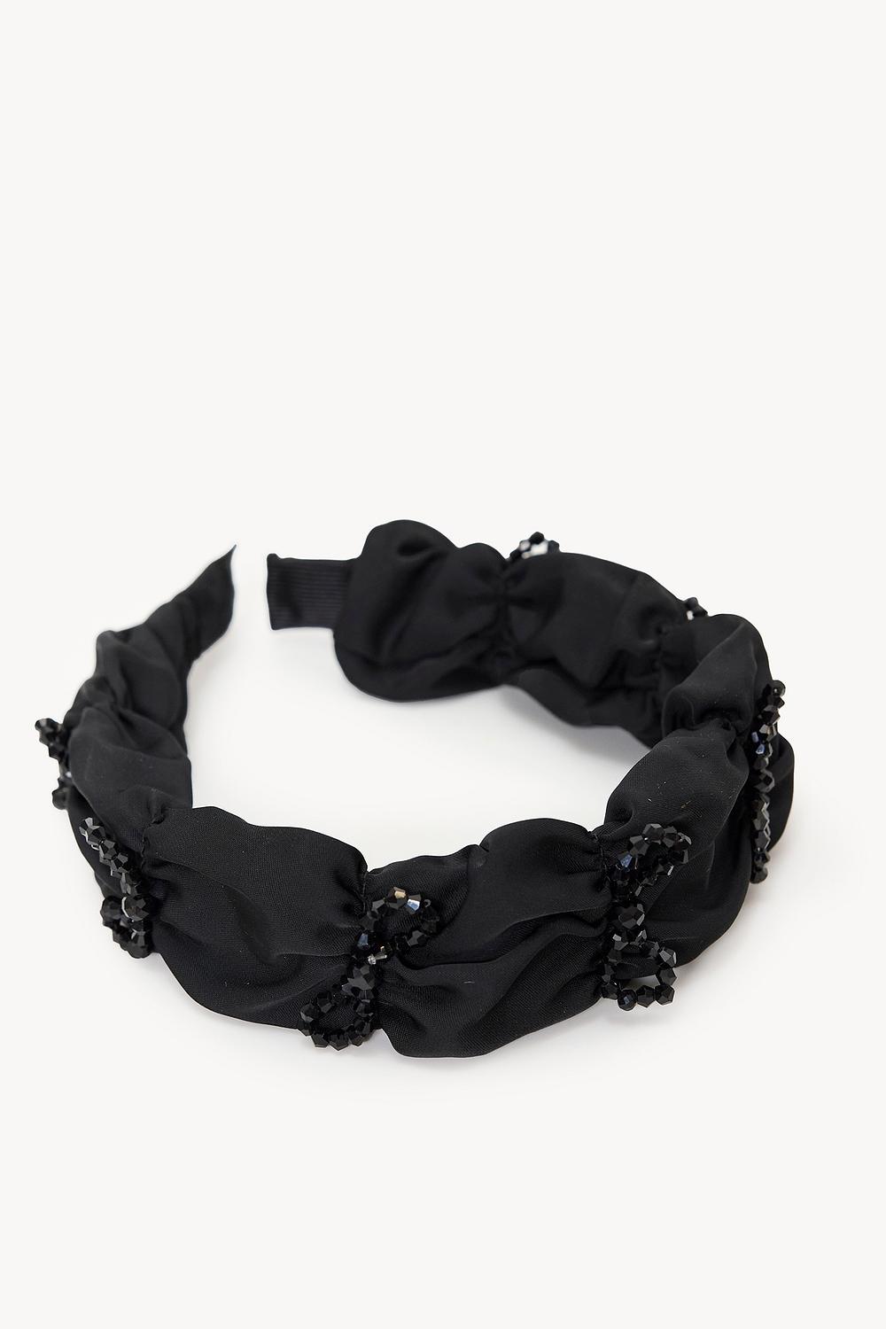 Ce bandeau noir présente un design drapé luxueux avec des détails perlés saisissants. Le tissu doux avec des perles audacieuses crée un accessoire chic qui rehausse instantanément votre look. Parfait pour garder vos cheveux élégamment hors de votre visage tout en ajoutant une touche sophistiquée à n'importe quelle tenue.