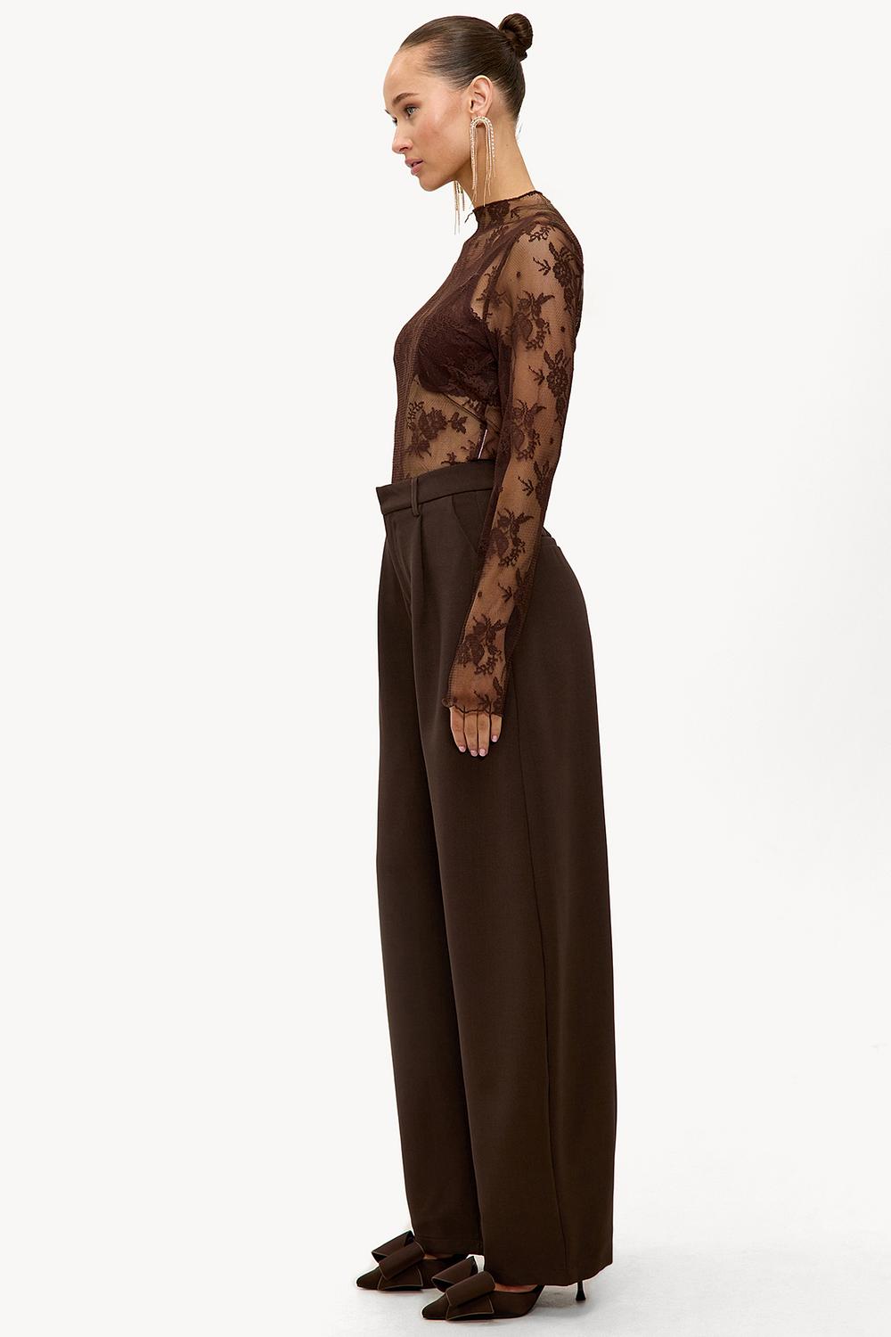 Ce pantalon large marron foncé a une coupe taille haute avec des plis ajustés pour un look chic. Les jambes larges et la ceinture ajustée créent une silhouette sophistiquée parfaite pour les occasions élégantes. Associez ce pantalon avec un haut transparent pour une tenue de rendez-vous dîner éblouissante.