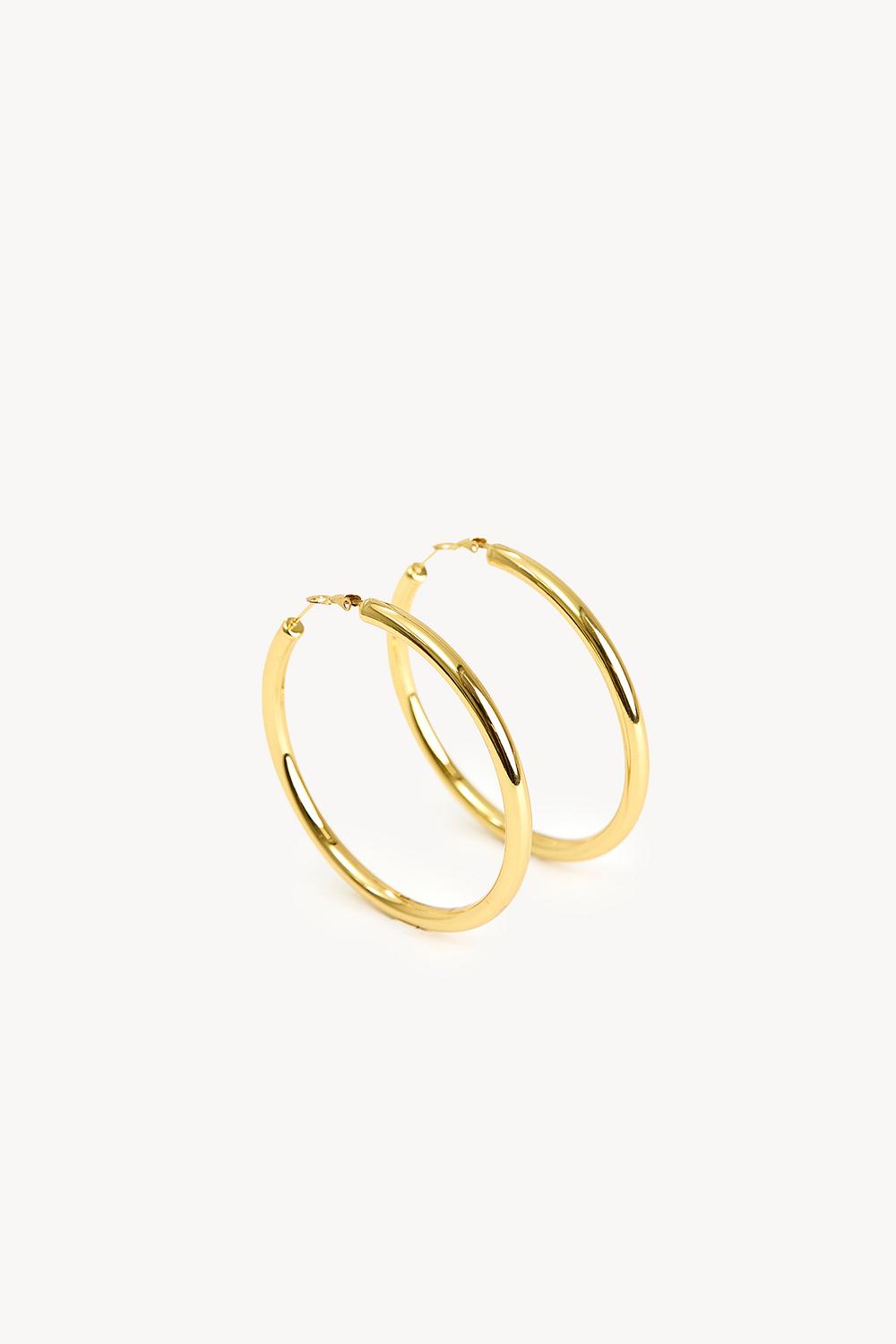 Ces boucles d'oreilles créoles dorées ont une forme ronde classique avec une finition dorée luxueuse. Les créoles de taille moyenne en acier inoxydable à 100% offrent une élégance intemporelle qui complète parfaitement n'importe quelle tenue. La couleur dorée brillante ajoute une touche chic à votre look.