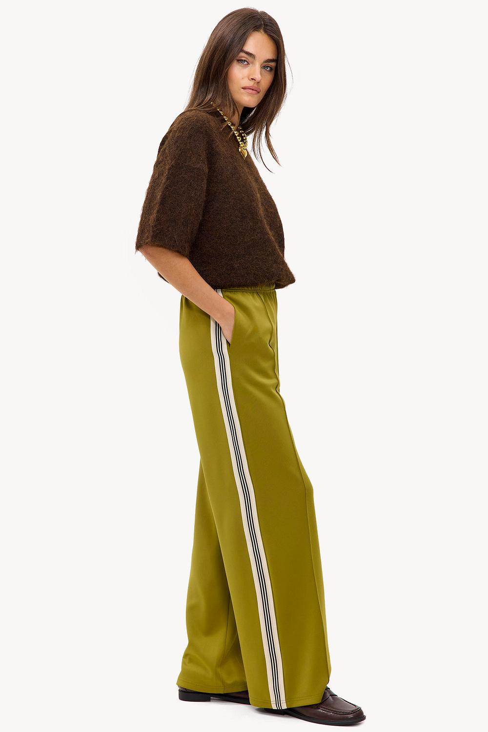 Ce pantalon kaki à jambes larges présente des bandes latérales blanches frappantes pour une touche sportive. La coupe taille haute avec jambes larges crée un look décontracté mais chic. La taille élastique assure confort et ajustement parfait. Associez ce pantalon à un tricot oversize pour un look décontracté et cool.