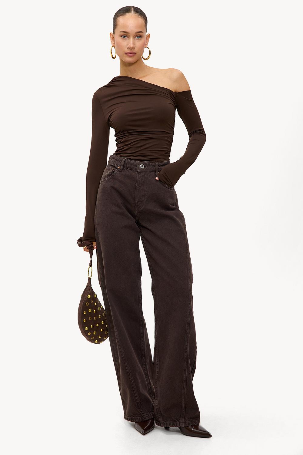 Ce haut épaules dénudées marron foncé présente un design asymétrique à une épaule avec des détails drapés remarquables. La coupe moulante avec une texture froncée sur le côté crée une forme moderne. Les manches longues et le tissu drapé donnent à ce haut une touche luxueuse. Associez ce haut avec un pantalon large taille haute pour un look chic.