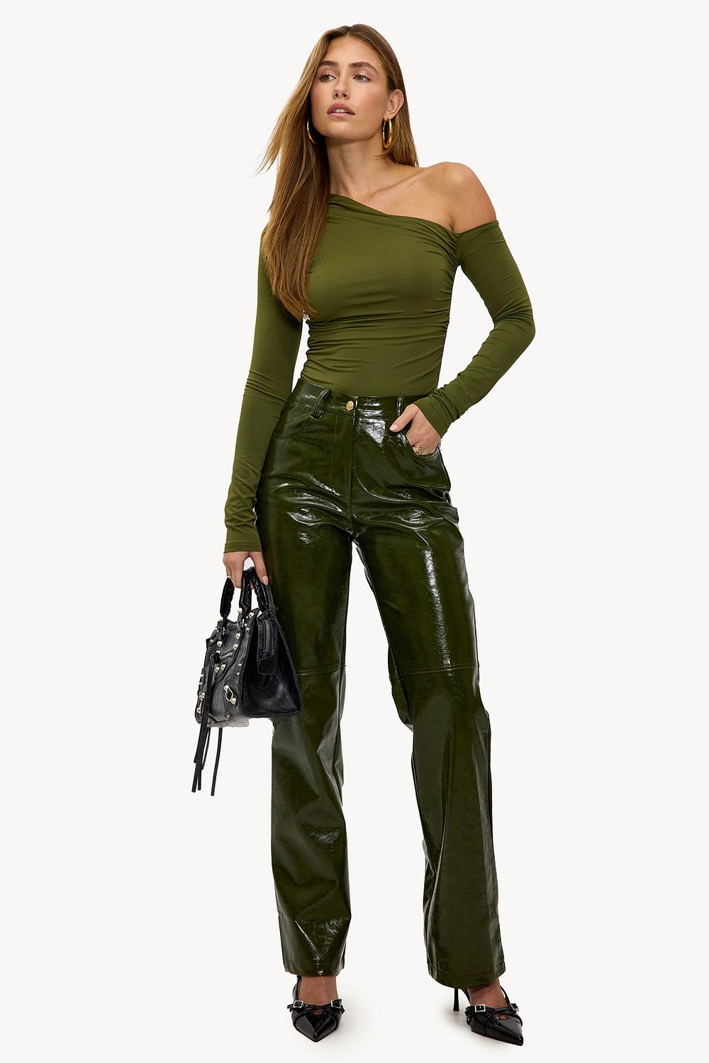 Ce haut vert à épaules dénudées présente un design asymétrique à une épaule avec des manches longues. La coupe moulante avec des fronces subtiles sur le côté accentue la silhouette de manière chic. La qualité stretch assure confort et ajustement parfait. Associez ce haut avec un pantalon effet cuir pour un look de dîner audacieux.
