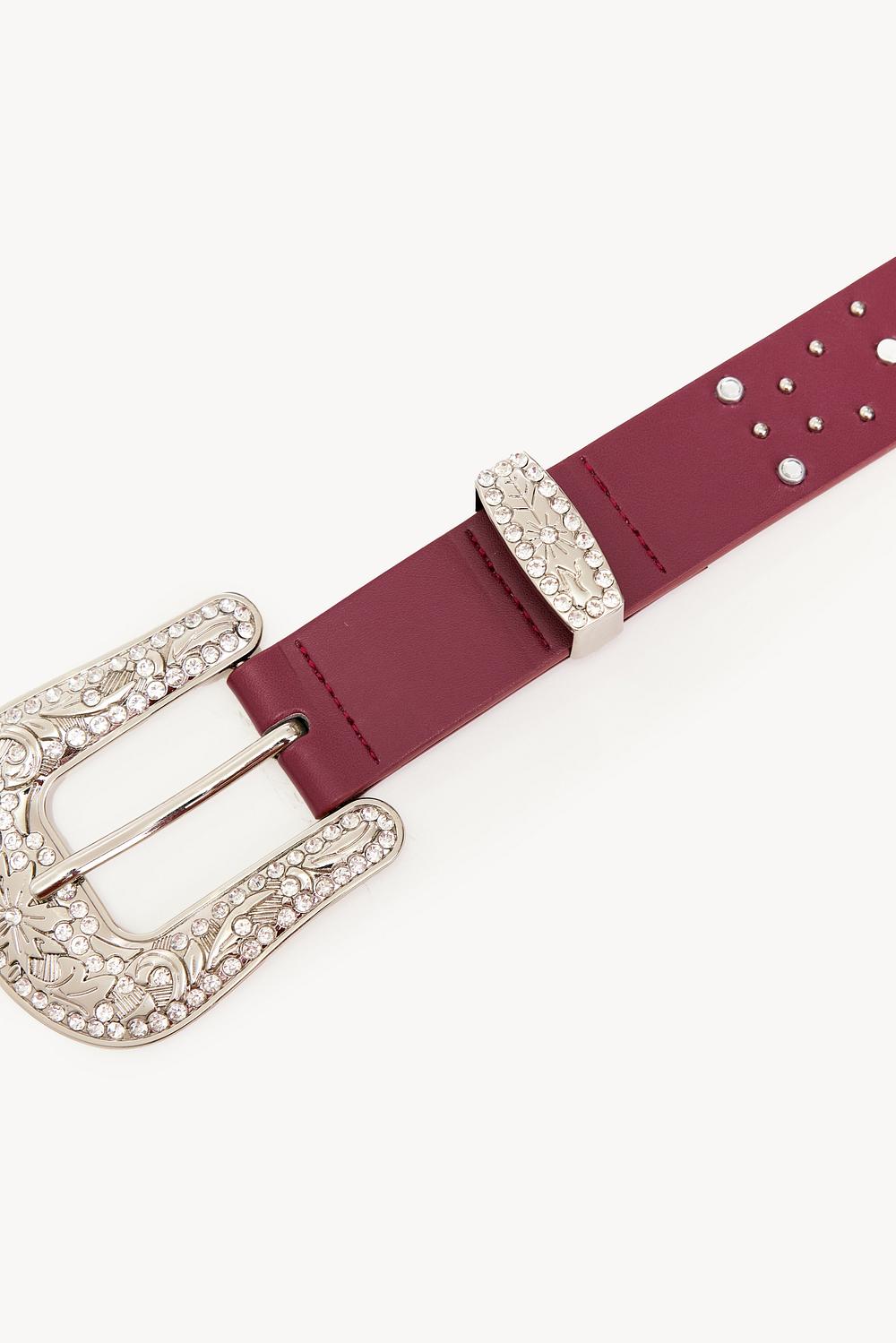 Ceinture bordeaux avec clous et métal argenté 25,99 €Cette ceinture bordeaux présente une boucle western audacieuse avec des clous saisissants partout pour un look audacieux. La finition en cuir végétalien se marie parfaitement avec la boucle argentée décorative aux détails gravés. Portez cette ceinture avec un jean taille haute et un blazer oversize pour une tenue inspirée du style western.