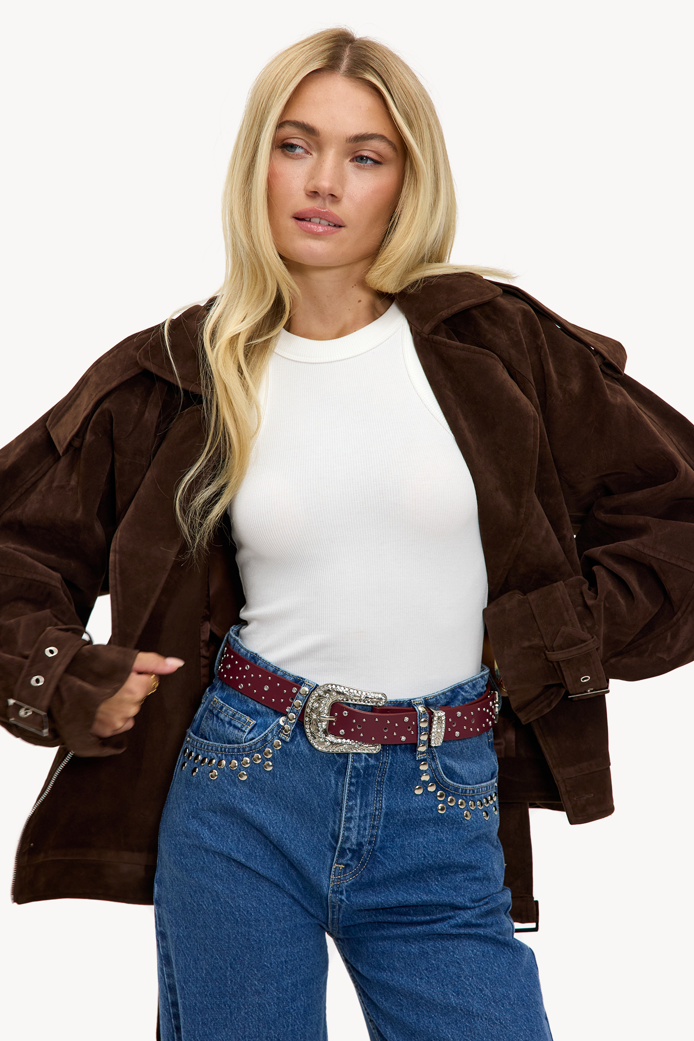 Cette ceinture bordeaux présente une boucle western audacieuse avec des clous saisissants partout pour un look audacieux. La finition en cuir végétalien se marie parfaitement avec la boucle argentée décorative aux détails gravés. Portez cette ceinture avec un jean taille haute et un blazer oversize pour une tenue inspirée du style western.
