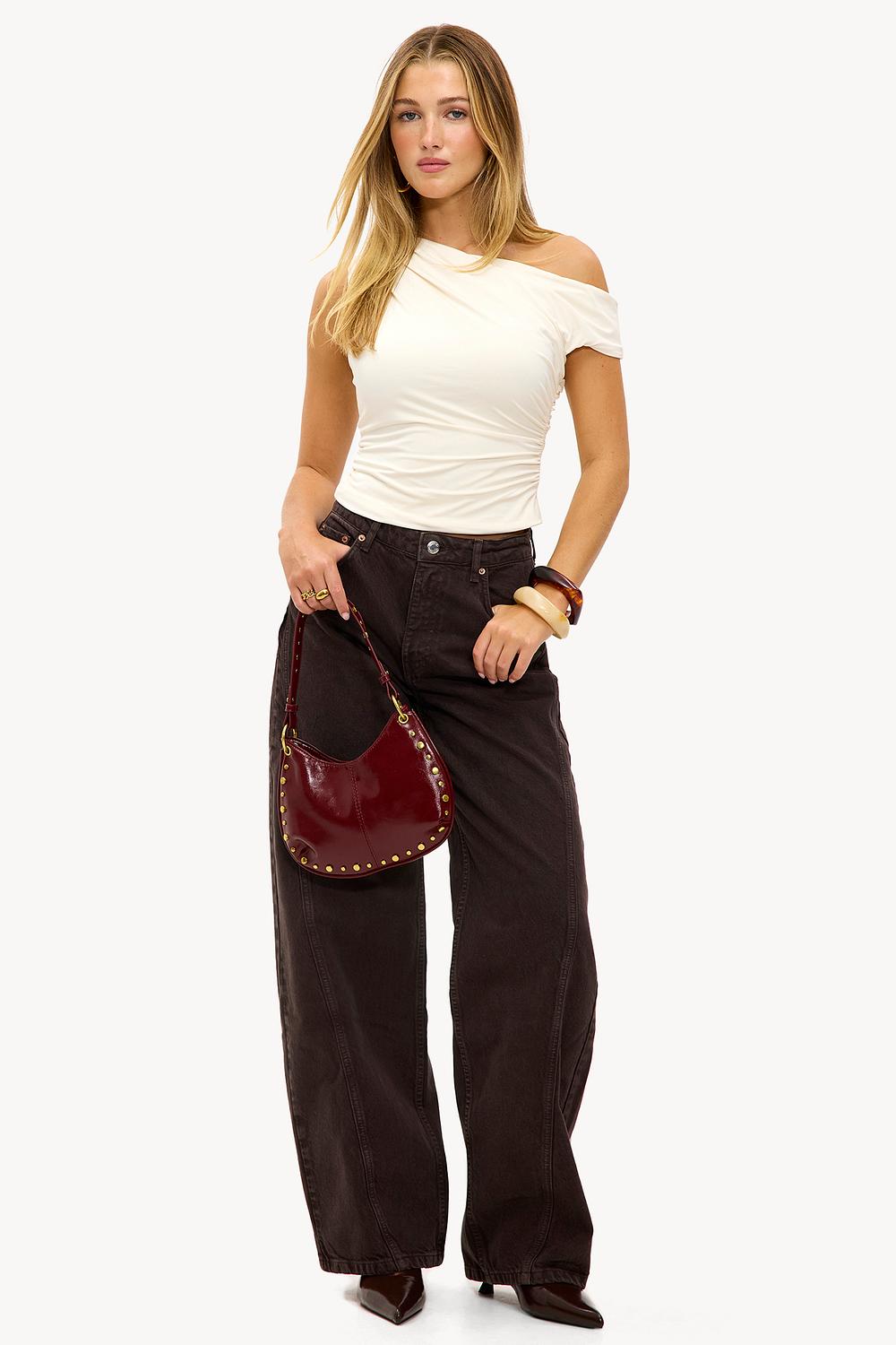 Ce haut épaules dénudées blanc cassé présente un design drapé élégant avec des détails froncés sur le côté. L'encolure asymétrique et les manches courtes créent un look chic. La qualité extensible assure un ajustement parfait qui accentue votre silhouette.