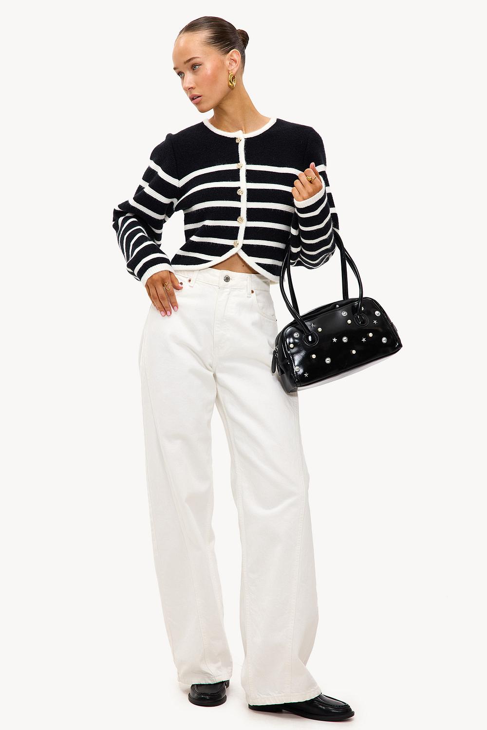 Ce cardigan rayé noir et blanc présente une coupe courte avec une fermeture à boutons audacieuse à l'avant. Le motif à rayures classique et la texture côtelée confèrent à ce tricot un attrait intemporel. La coupe courte crée une touche moderne au design traditionnel du cardigan. Associez ce cardigan à un jean taille haute pour un look chic et décontracté.