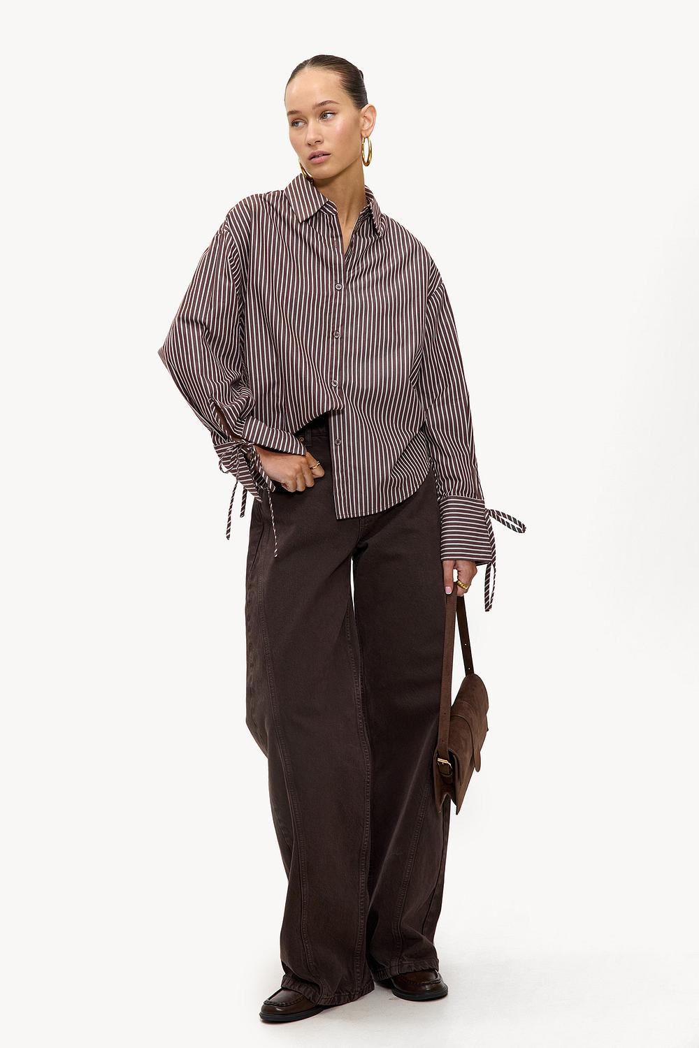 Cette blouse rayée marron a une coupe oversize avec des détails noués sur les manches. La fermeture boutonnée classique et la qualité du coton doux donnent à cette blouse une apparence intemporelle. La coupe ample avec des nœuds décoratifs crée un look décontracté mais chic. Associez cette blouse avec des pantalons à jambes larges pour une tenue décontractée sans effort.
