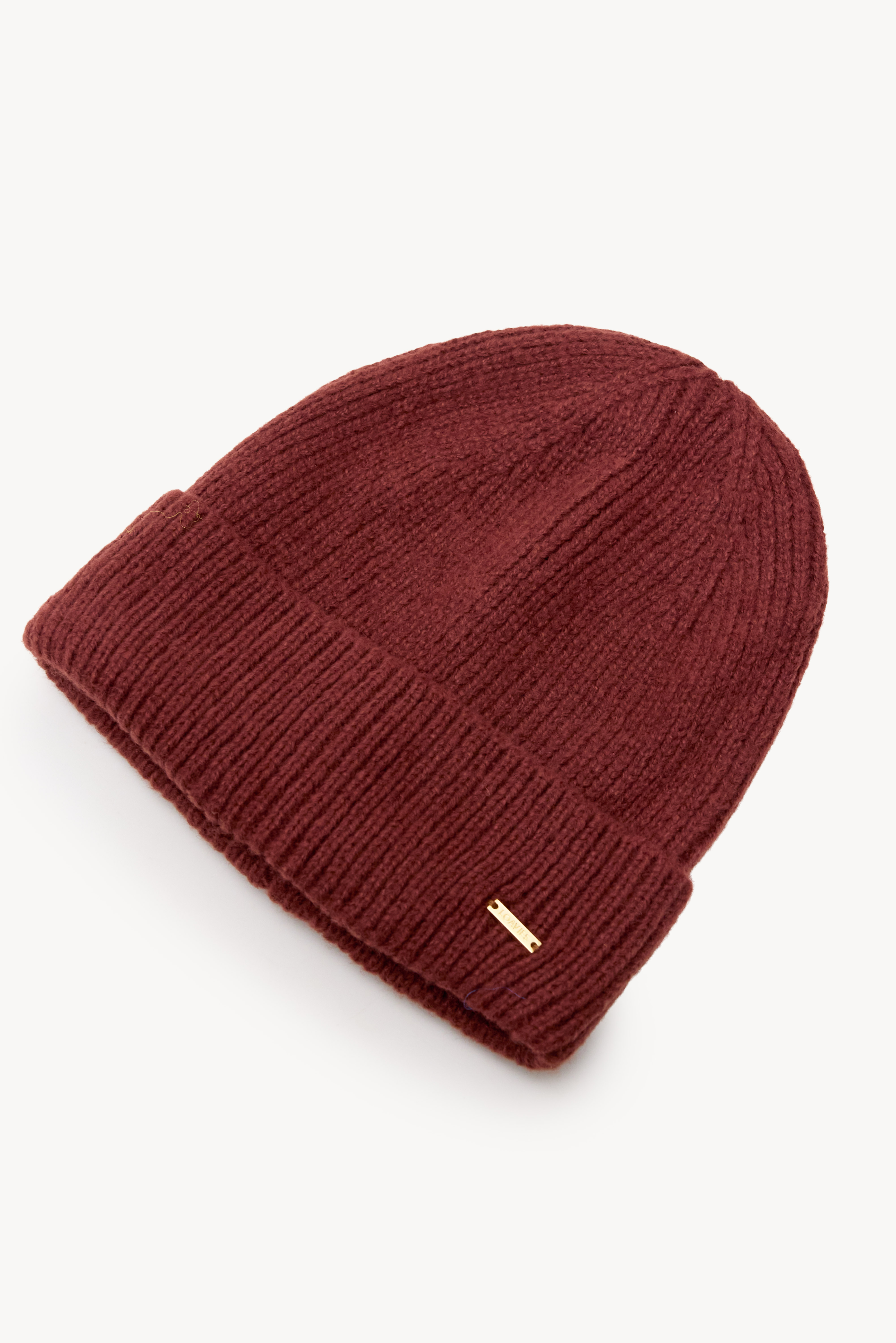 Ce bonnet brun foncé présente une structure côtelée classique pour un look intemporel. Le détail doré à l'avant ajoute une touche luxueuse à ce chapeau. La couleur brun foncé chaude et la coupe confortable rendent ce bonnet parfait pour les jours plus frais. Associez ce chapeau à un manteau oversize pour un look d'hiver chic.