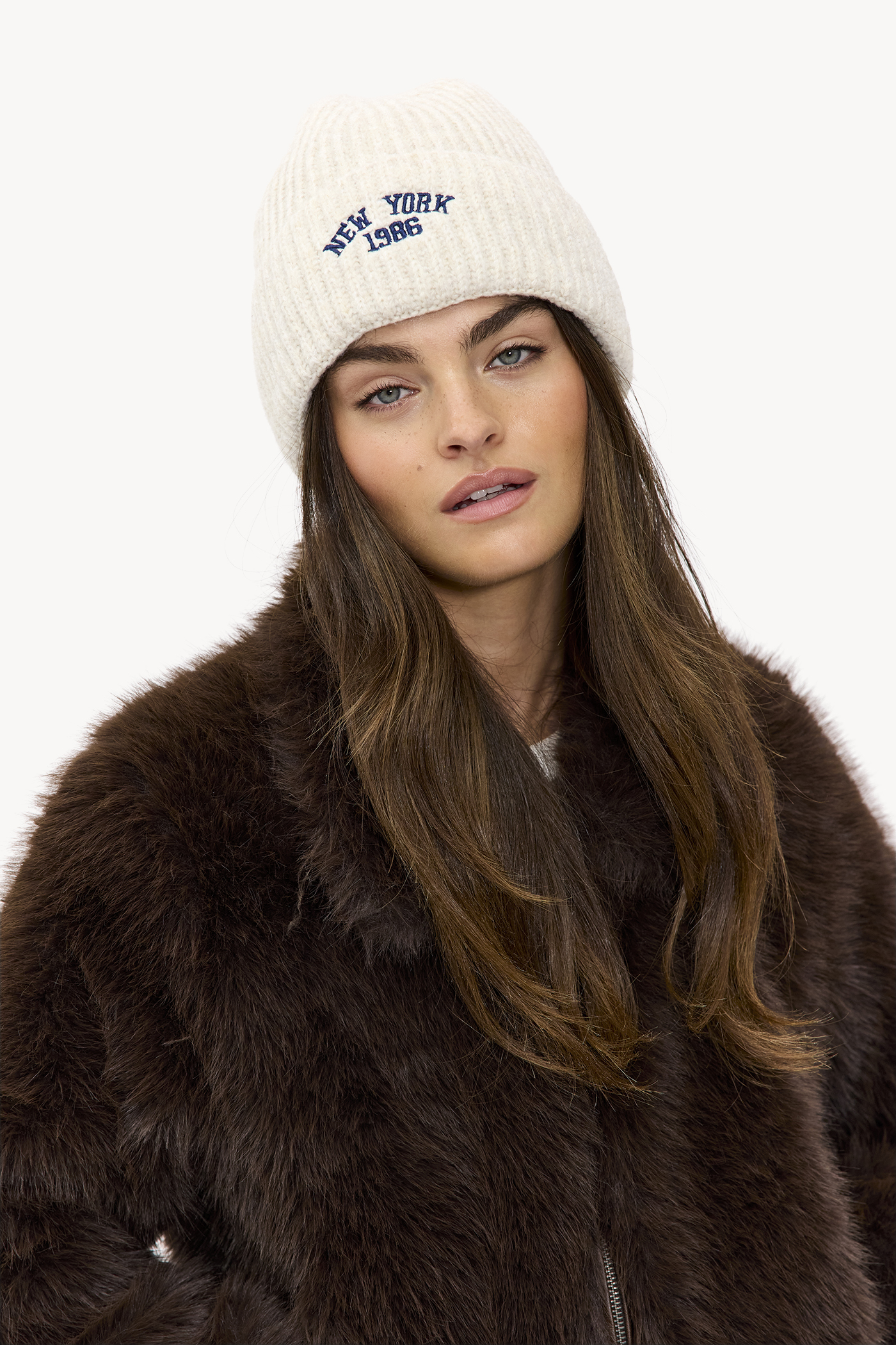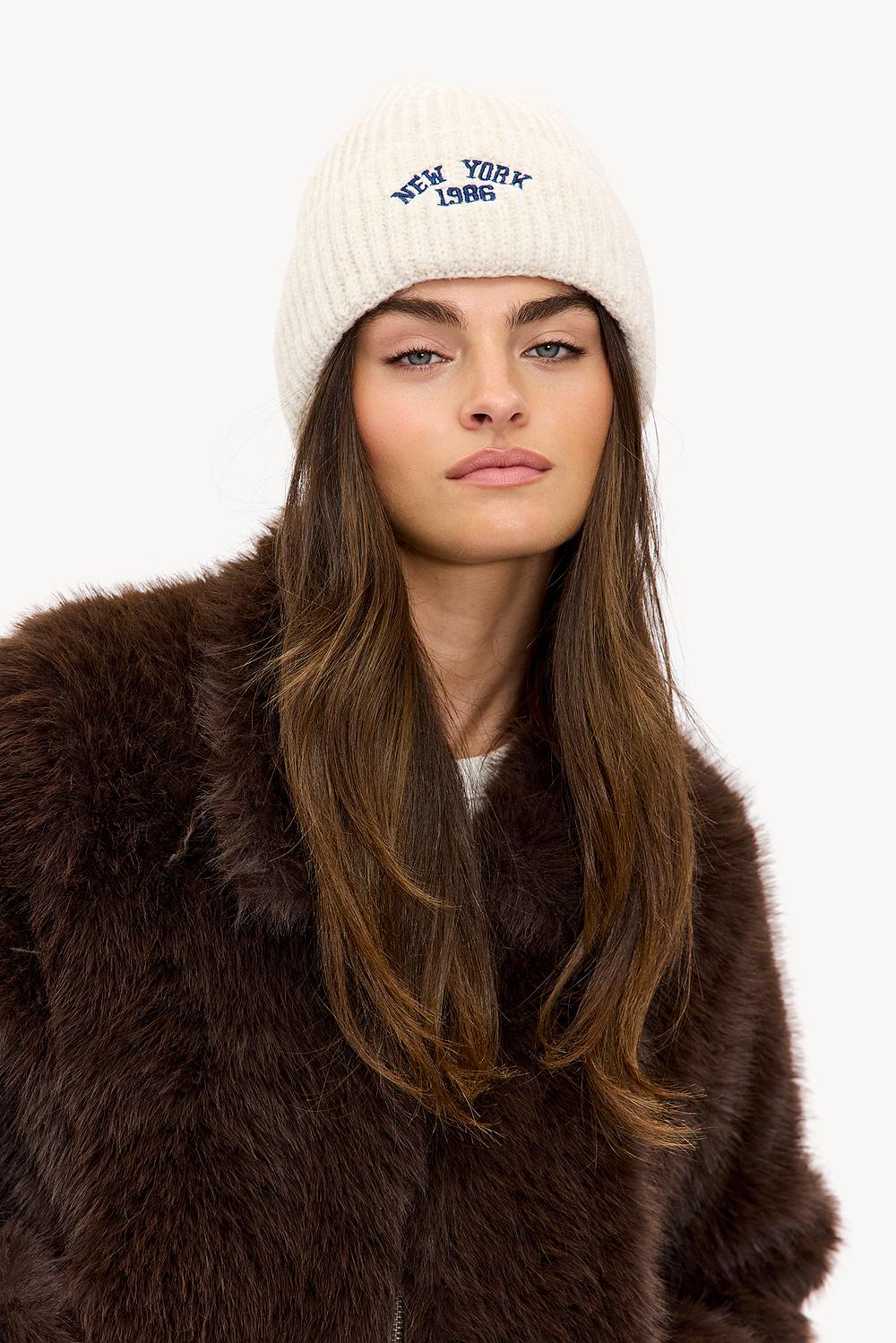 Ce bonnet côtelé beige a une coupe classique avec un bord retroussé. La couleur blanc cassé chaude et la broderie 'New York 1998' donnent à ce chapeau une touche vintage cool. Le mélange d'acrylique doux assure confort et chaleur pendant les jours froids.