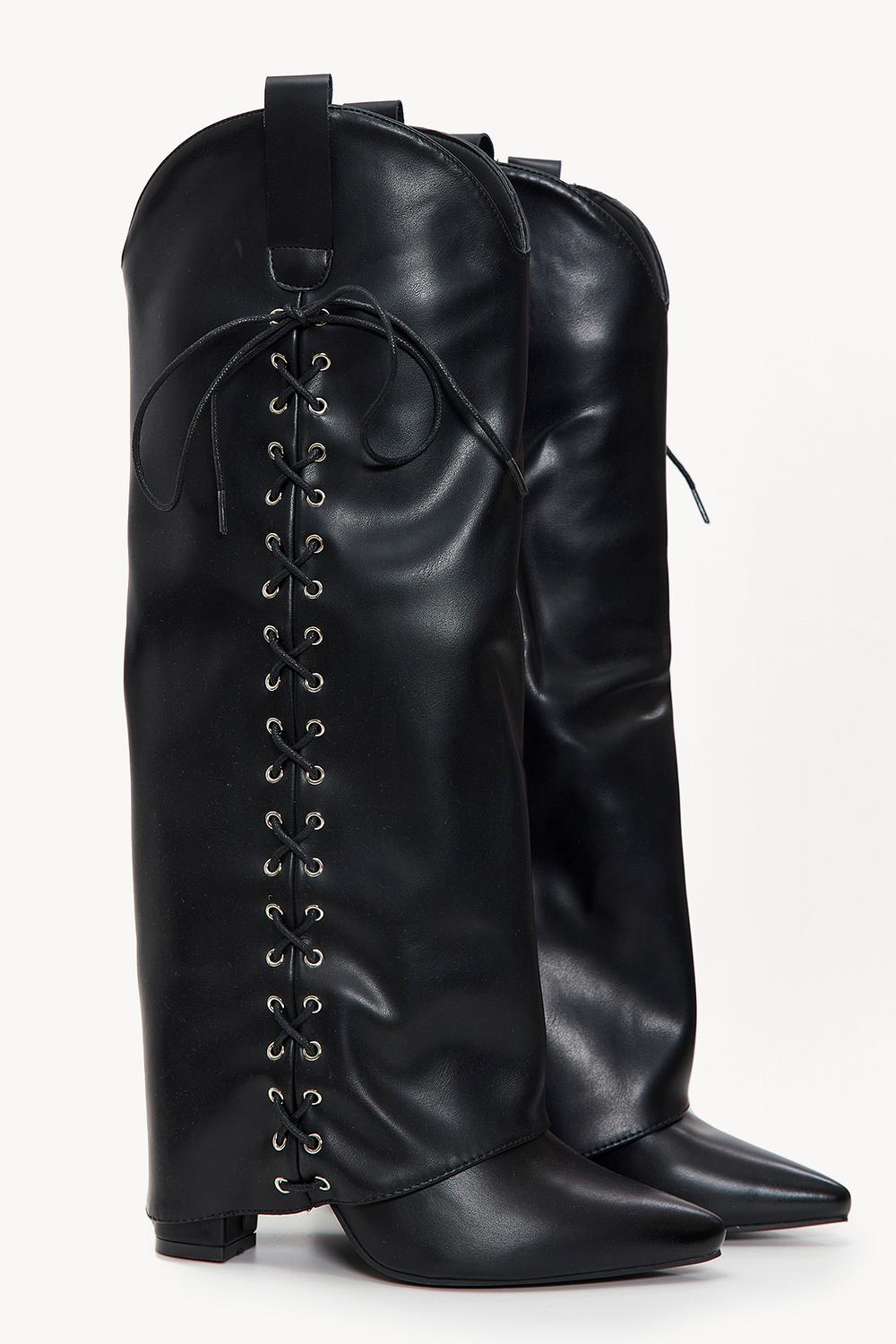 Ces bottes en dentelle noire présentent un design à lacets frappant sur le côté pour un look audacieux. La tige haute avec un bout pointu et un talon bloc crée une ambiance western moderne. Le cuir végétalien offre une finition luxueuse avec une qualité durable. Associez ces bottes avec un tricot oversize et une mini-jupe pour un look contrasté cool.