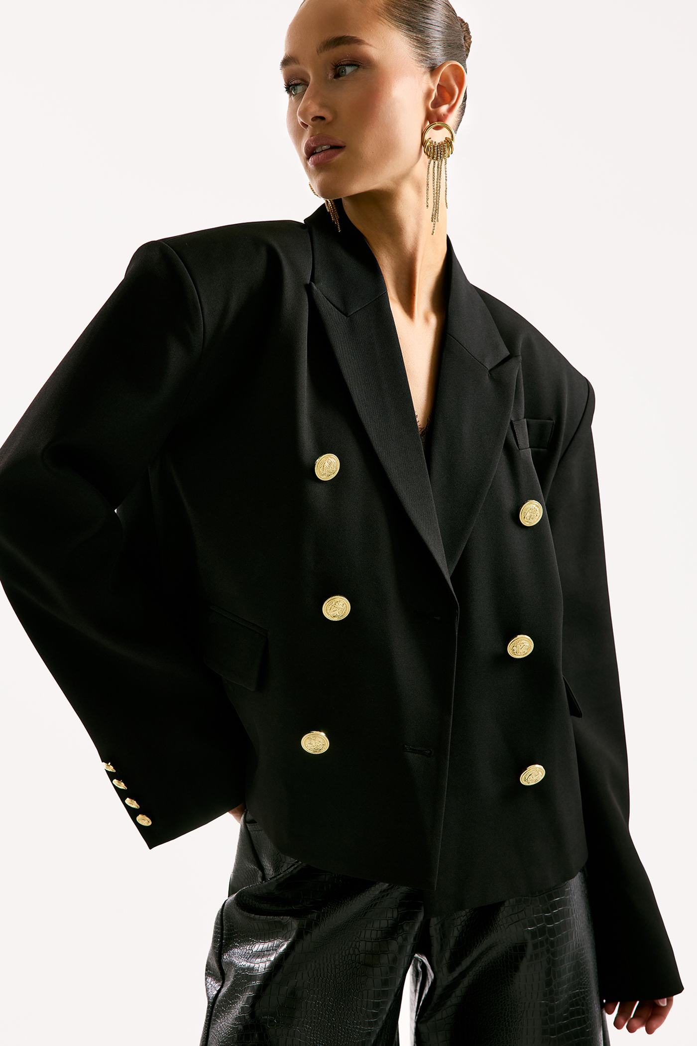 Ce blazer noir à double boutonnage présente des boutons dorés pour une touche luxueuse. La coupe oversize avec des revers larges et une taille cintrée crée un look puissant. Associez ce blazer avec un pantalon effet cuir pour un look de bureau chic.