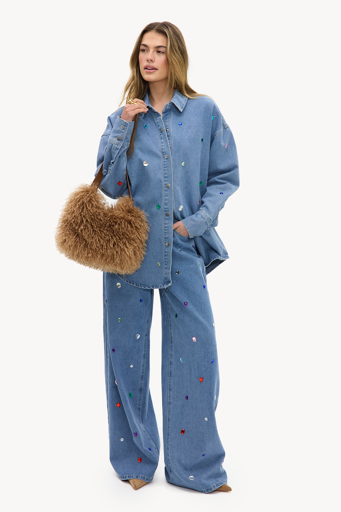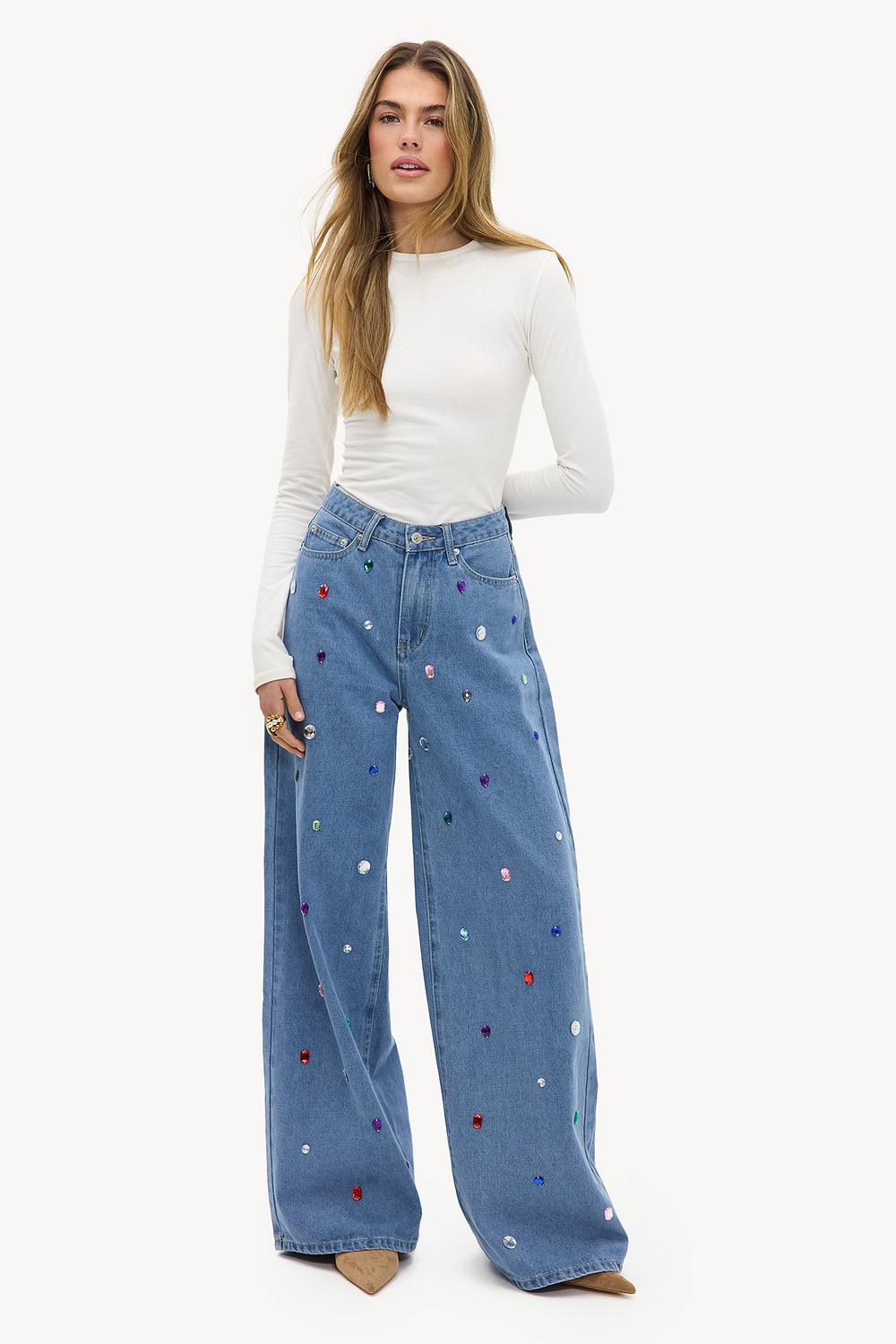Ce jean à jambes larges présente un design clouté saisissant avec des pierres colorées. La coupe taille haute avec jambes larges crée un look affirmé qui correspond parfaitement à la tendance denim actuelle. La qualité 100% coton assure confort et durabilité. Associez ce jean avec la blouse en denim assortie pour un look coordonné cool.