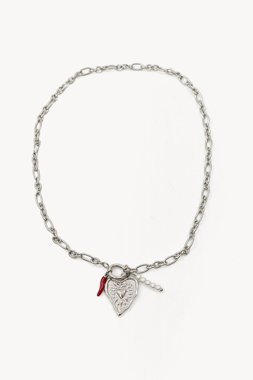 Ce collier en chaîne argentée présente un pendentif cœur saisissant avec des détails rouges pour un look affirmé. La chaîne épaisse se combine parfaitement avec le charme décoratif en forme de cœur qui a une texture subtile. La longueur ajustable rend ce collier polyvalent à styliser. Parfait pour superposer avec d'autres colliers ou porter en solo pour une touche audacieuse.