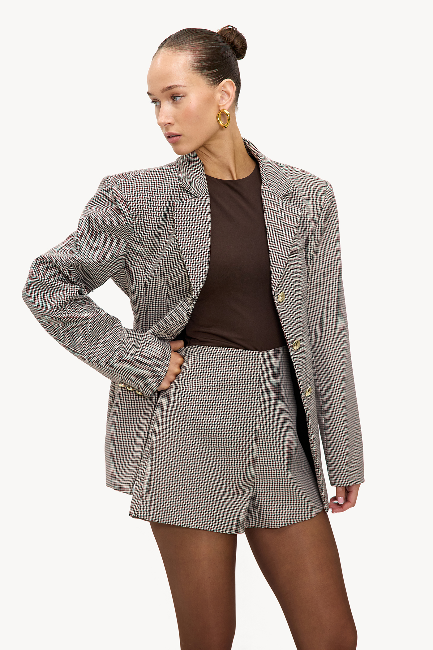 Ce short beige présente un motif pied-de-poule classique pour un look intemporel. La coupe taille haute avec des détails ajustés crée une apparence chic. Associez ce short avec le blazer assorti pour un look coordonné complet pendant les journées de bureau.