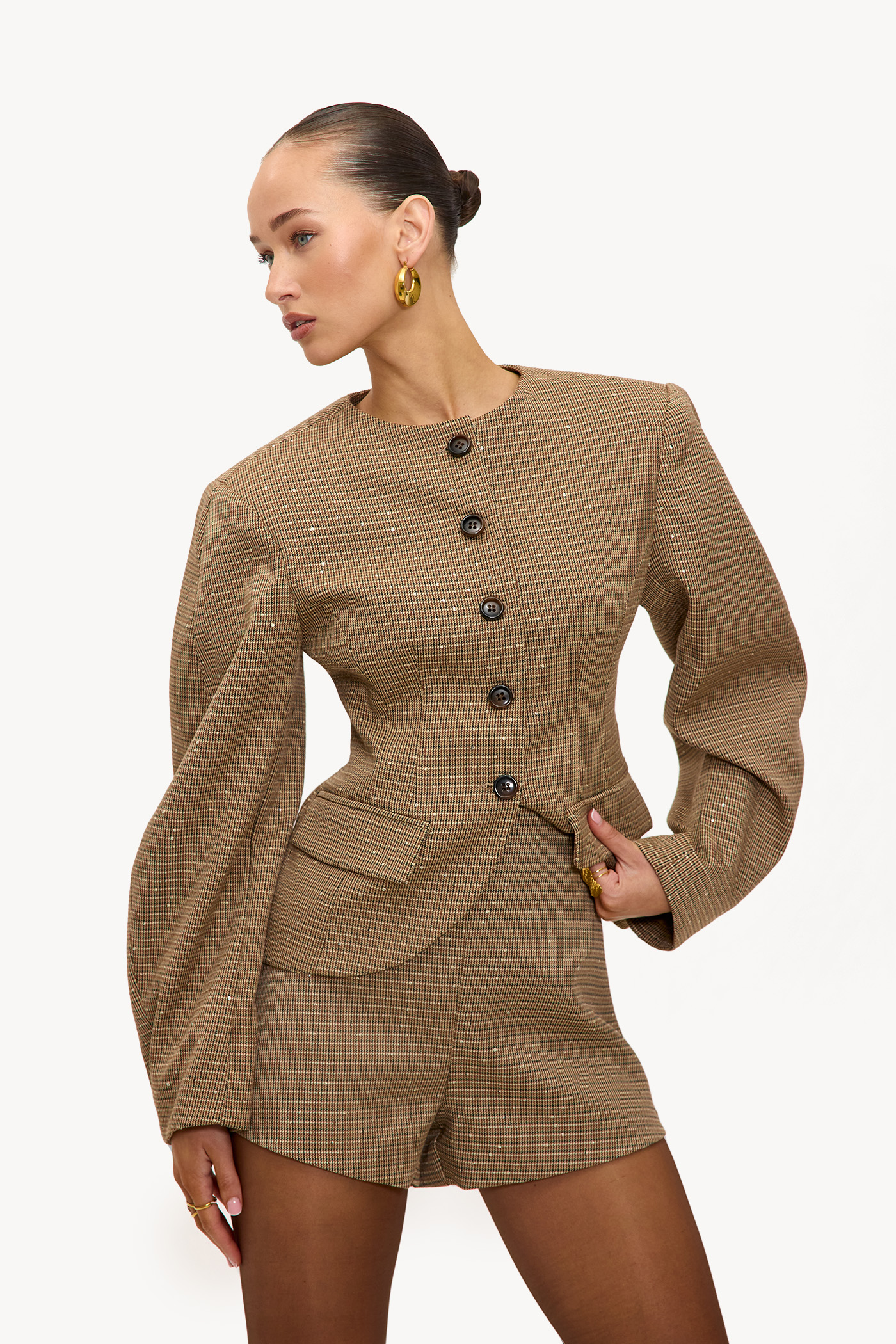 Short marron clair à carreaux et strass 45,99 €Ce short marron présente un motif à carreaux chic pour un look sophistiqué. La coupe taille haute avec une légère élasticité assure confort et une silhouette flatteuse. Associez ce short à un blazer assorti pour un look coordonné complet lors des journées de bureau.