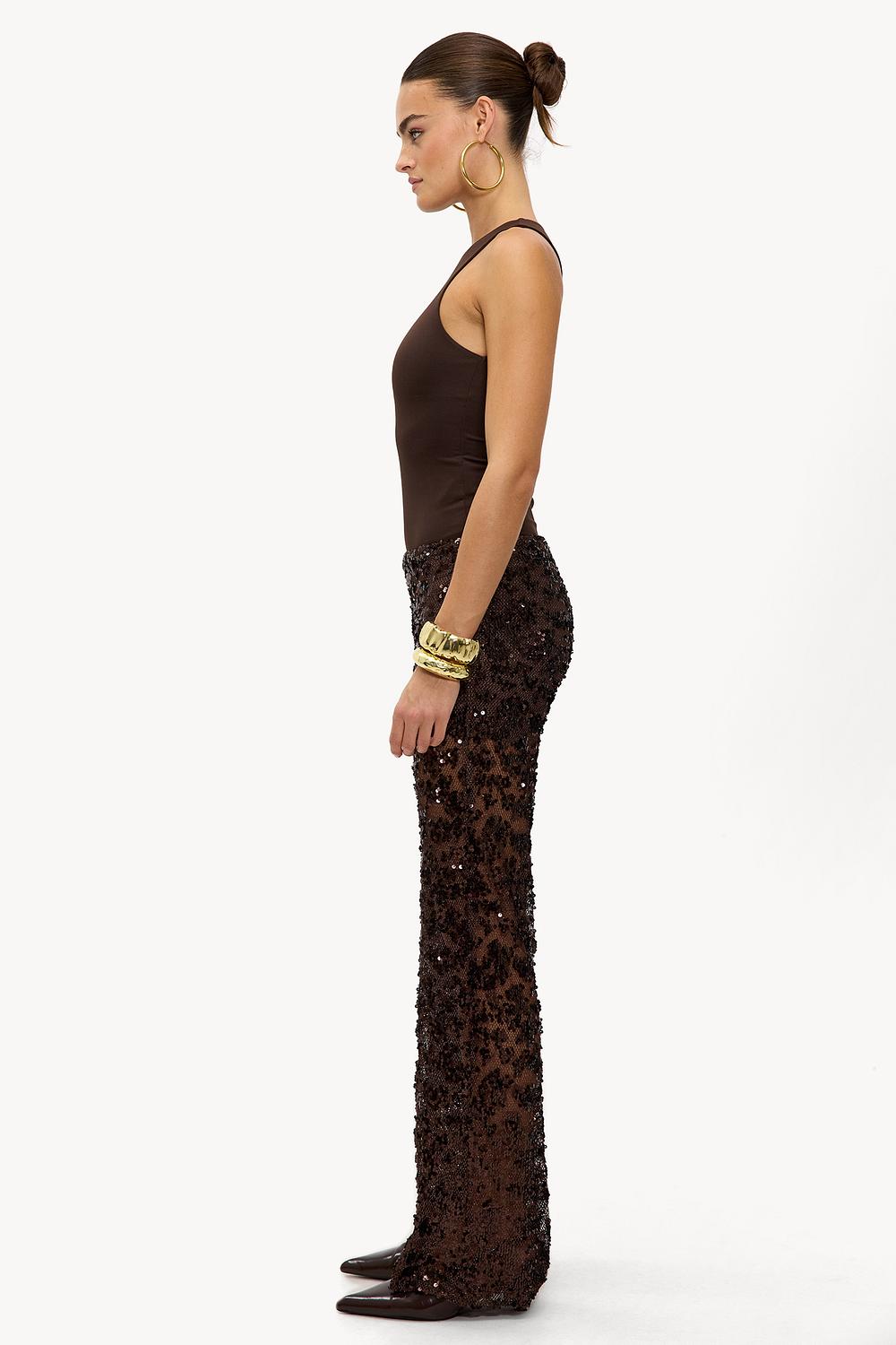 Ce pantalon droit marron est orné de sequins pour un look de déclaration luxueux. La coupe droite avec une taille haute crée une apparence moderne avec un supplément de glamour. La couleur marron foncé avec des détails scintillants assure un look chic prêt pour la fête. Associez ce pantalon avec un haut basique et des accessoires de déclaration pour une soirée entre filles.