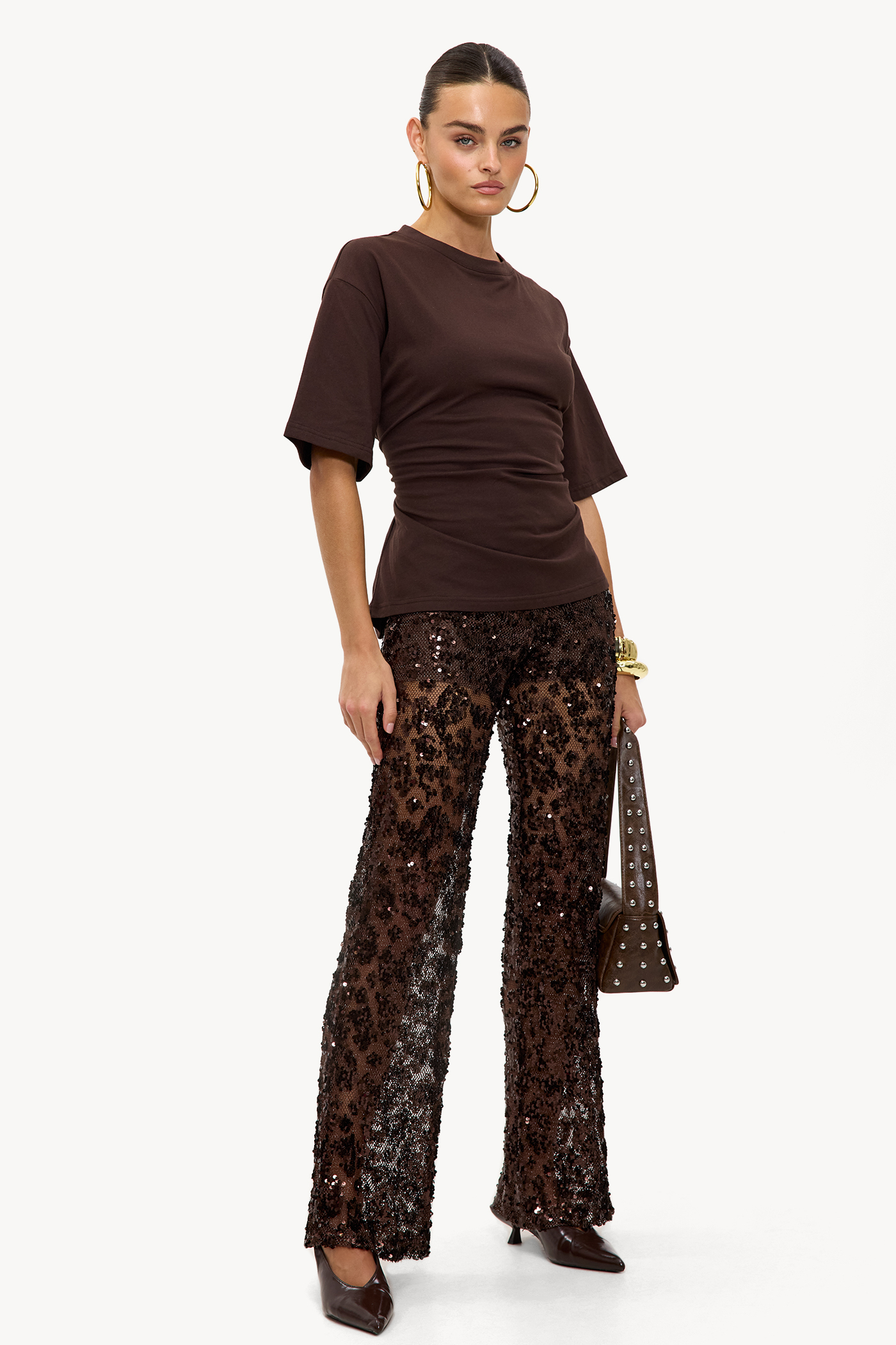 Ce pantalon droit marron est orné de sequins pour un look de déclaration luxueux. La coupe droite avec une taille haute crée une apparence moderne avec un supplément de glamour. La couleur marron foncé avec des détails scintillants assure un look chic prêt pour la fête. Associez ce pantalon avec un haut basique et des accessoires de déclaration pour une soirée entre filles.