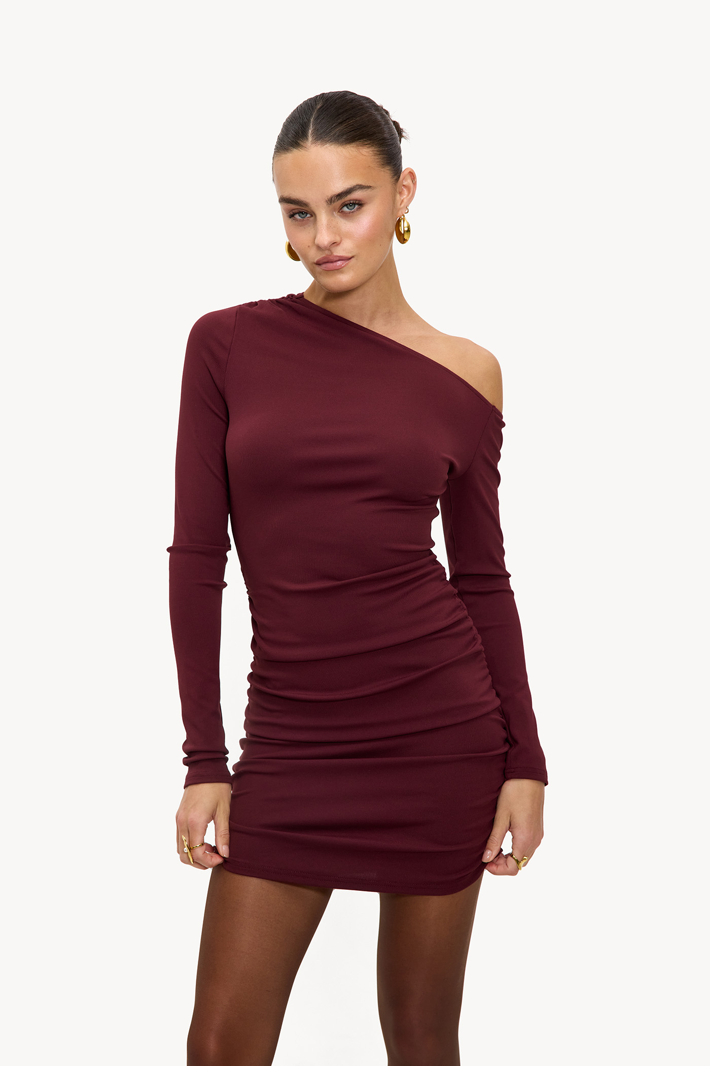 Cette robe mini bordeaux présente un design à épaules dénudées avec un décolleté asymétrique. La coupe moulante avec des détails froncés sur le côté accentue parfaitement la silhouette. Les manches longues et la qualité stretch assurent confort et apparence luxueuse. Associez cette robe avec des boucles d'oreilles audacieuses et des talons pointus pour un look de dîner en tête-à-tête.