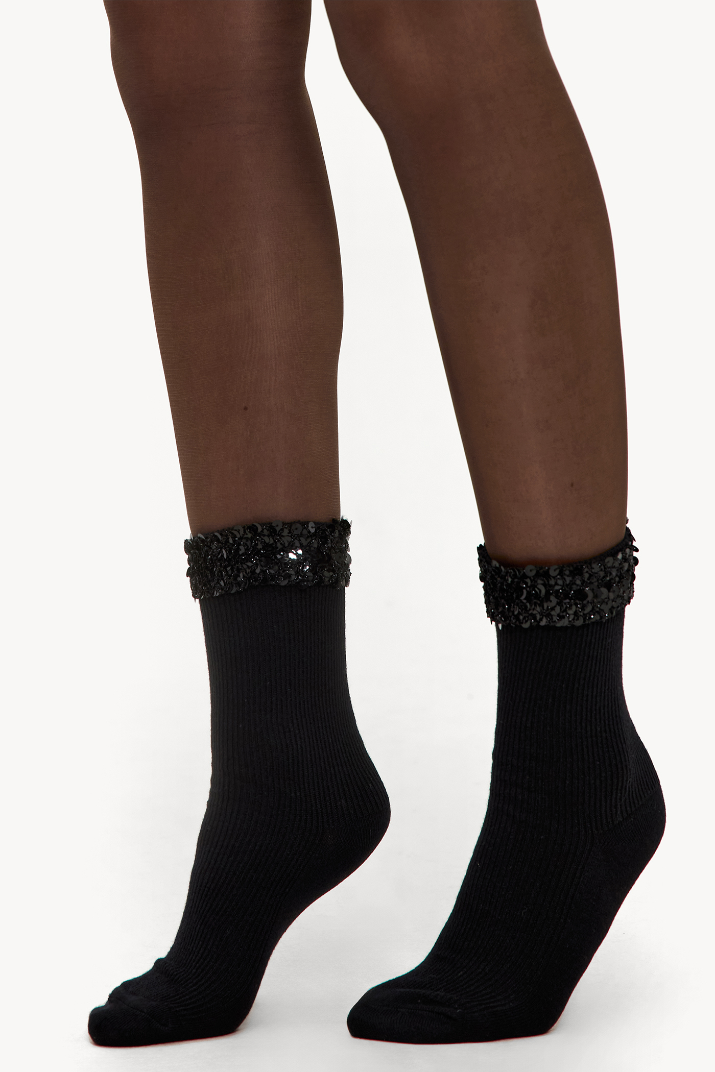 Ces chaussettes noires présentent des sequins frappants en haut pour une touche glamour. Le mélange de coton assure le confort tandis que les détails scintillants font une déclaration. Parfait pour compléter votre look de fête avec une touche luxueuse.