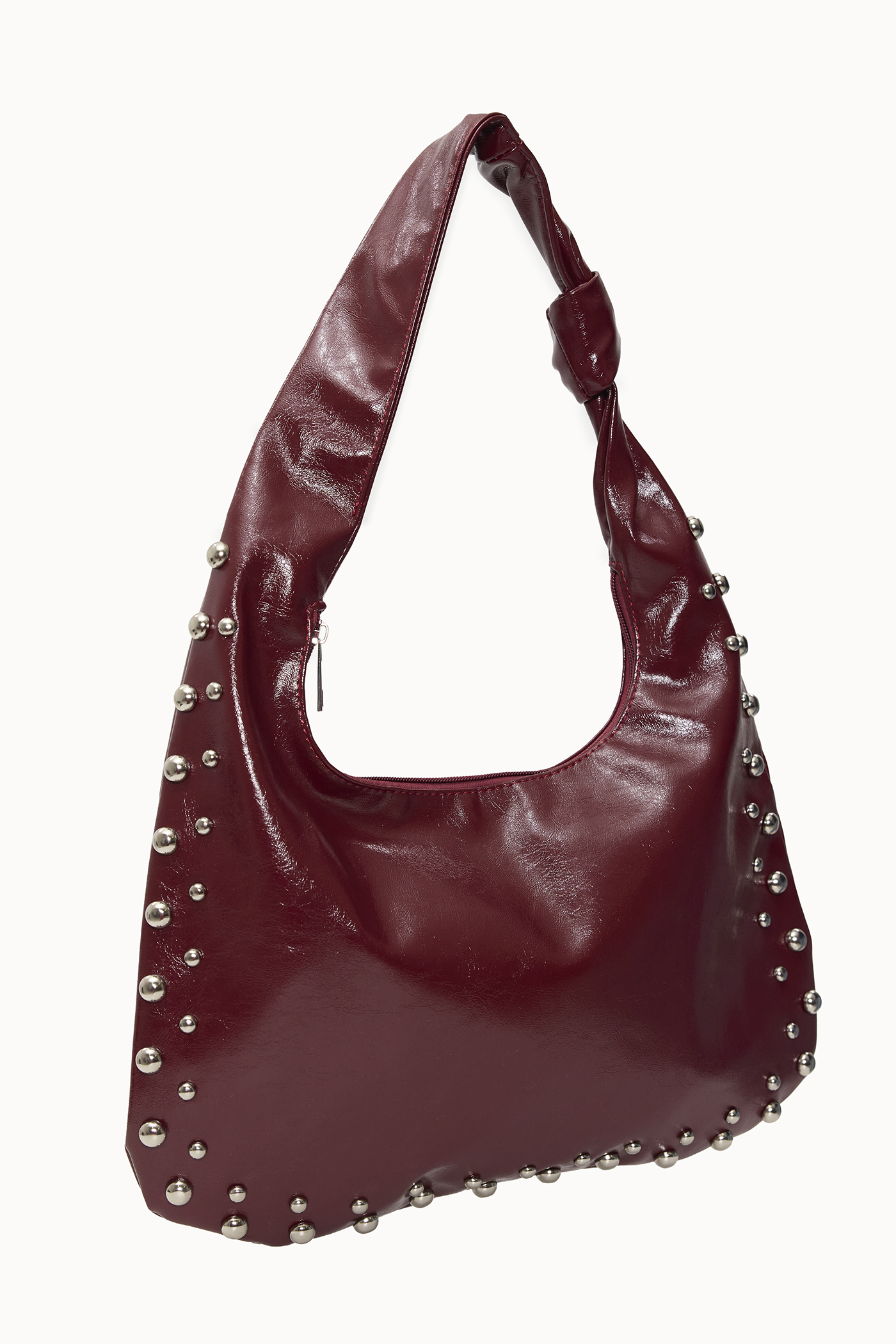 Ce sac fourre-tout bordeaux présente une finition aspect cuir avec des clous frappants pour une touche audacieuse. La forme spacieuse avec bandoulière assure confort et style. La qualité en polyuréthane doux donne à ce sac un aspect haut de gamme. Associez ce sac statement à une tenue décontractée pour un look rock-chic cool.