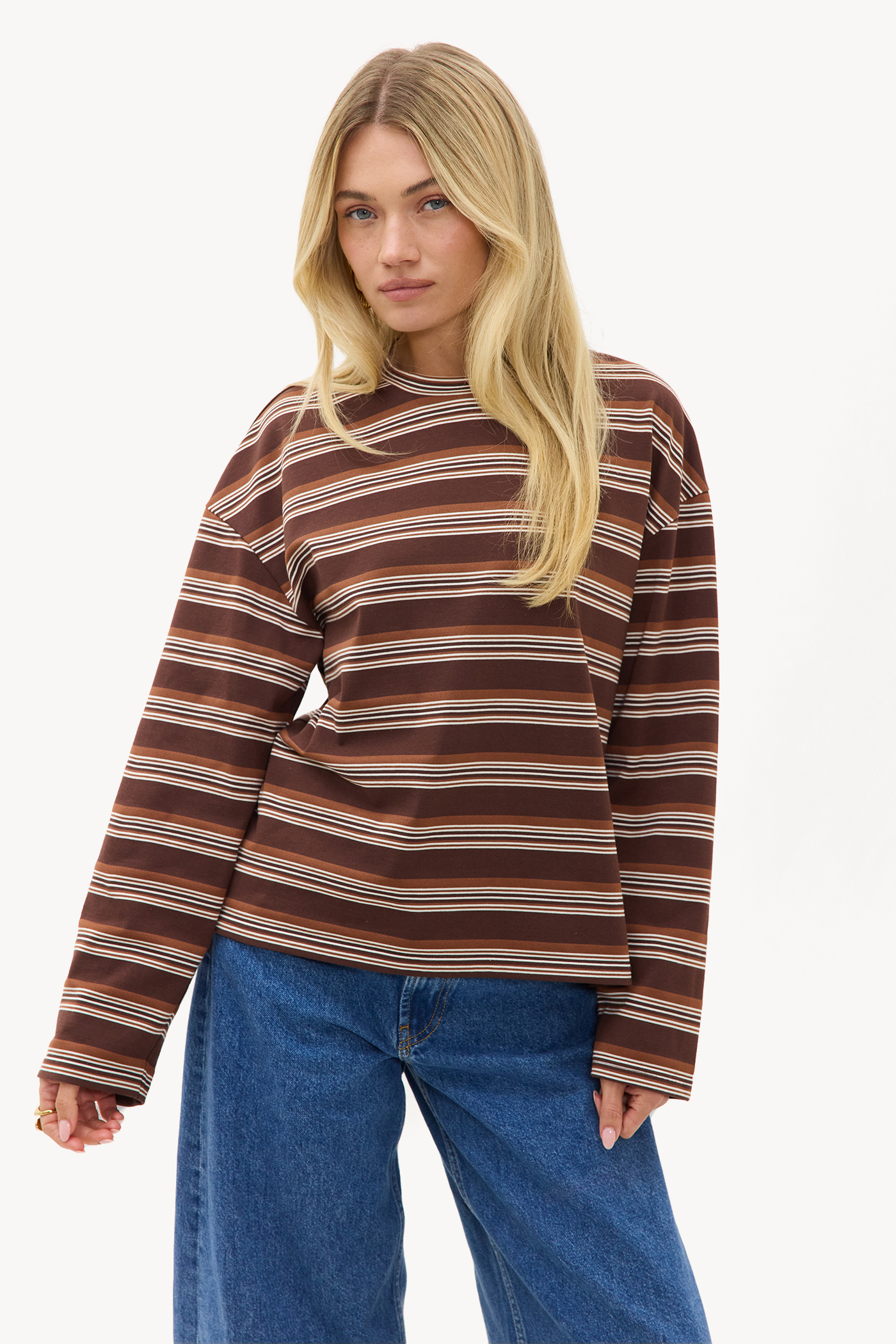 T-shirt marron à rayures 35,99 €Ce t-shirt à manches longues marron a un motif à rayures classique dans des tons terre chauds. La coupe décontractée avec un col rond et des manches longues crée un look casual confortable. Les rayures horizontales donnent une ambiance rétro à cet article basique polyvalent. Associez ce t-shirt à manches longues avec un pantalon cargo à jambes larges pour une tenue de week-end décontractée.