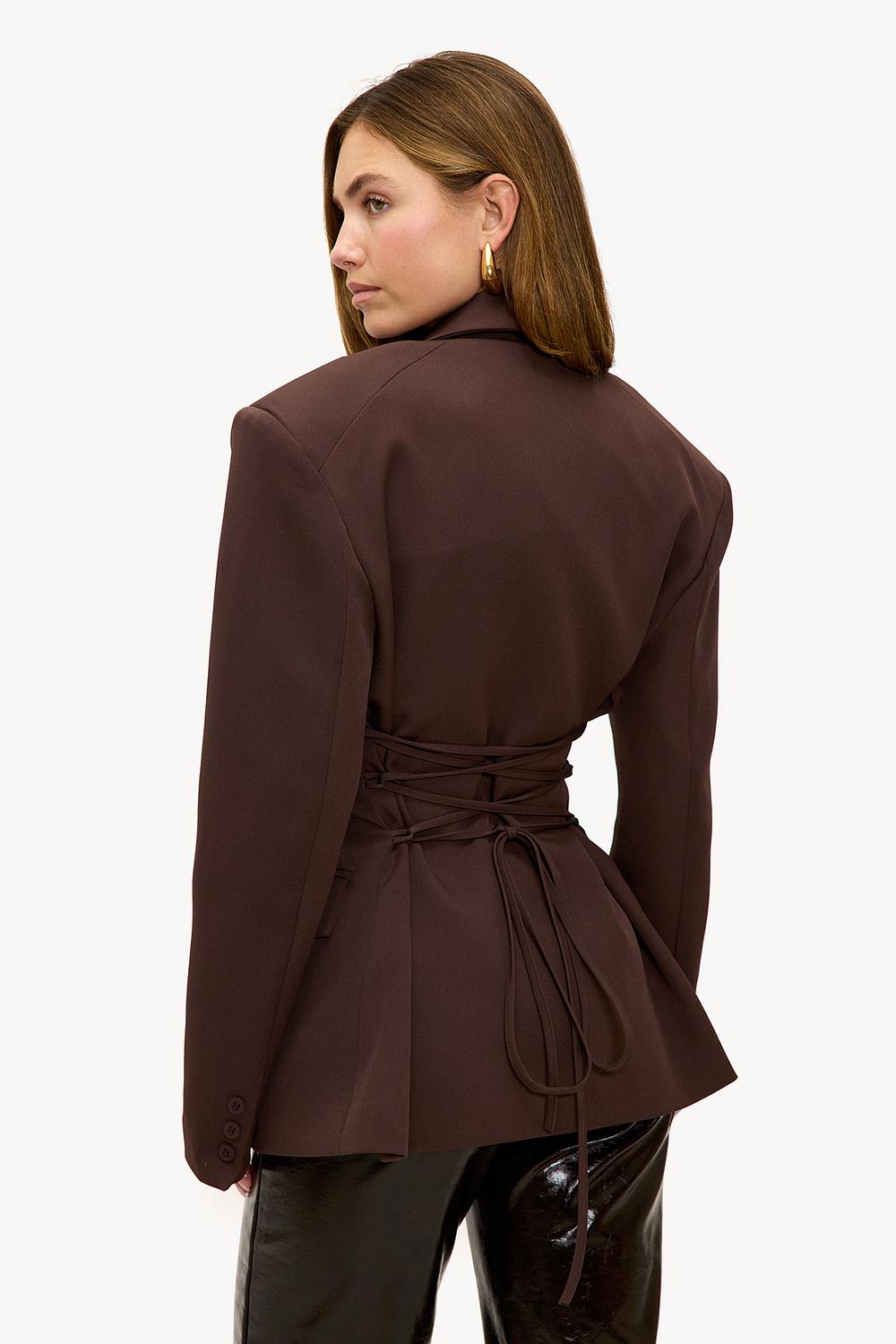 Ce blazer marron chocolat a une coupe oversize avec des détails de corset à l'arrière. La coupe ajustée avec des revers classiques et une fermeture à un bouton crée un look chic. Le détail lacé frappant à l'arrière ajoute une touche moderne au design intemporel du blazer. Associez ce blazer avec un pantalon aspect cuir pour un look business audacieux.